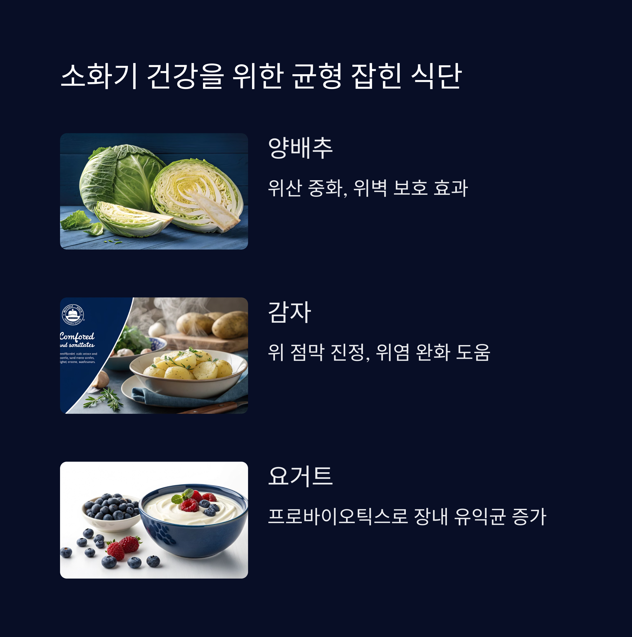 | 양배추 | 위산 억제, 위벽 보호 |