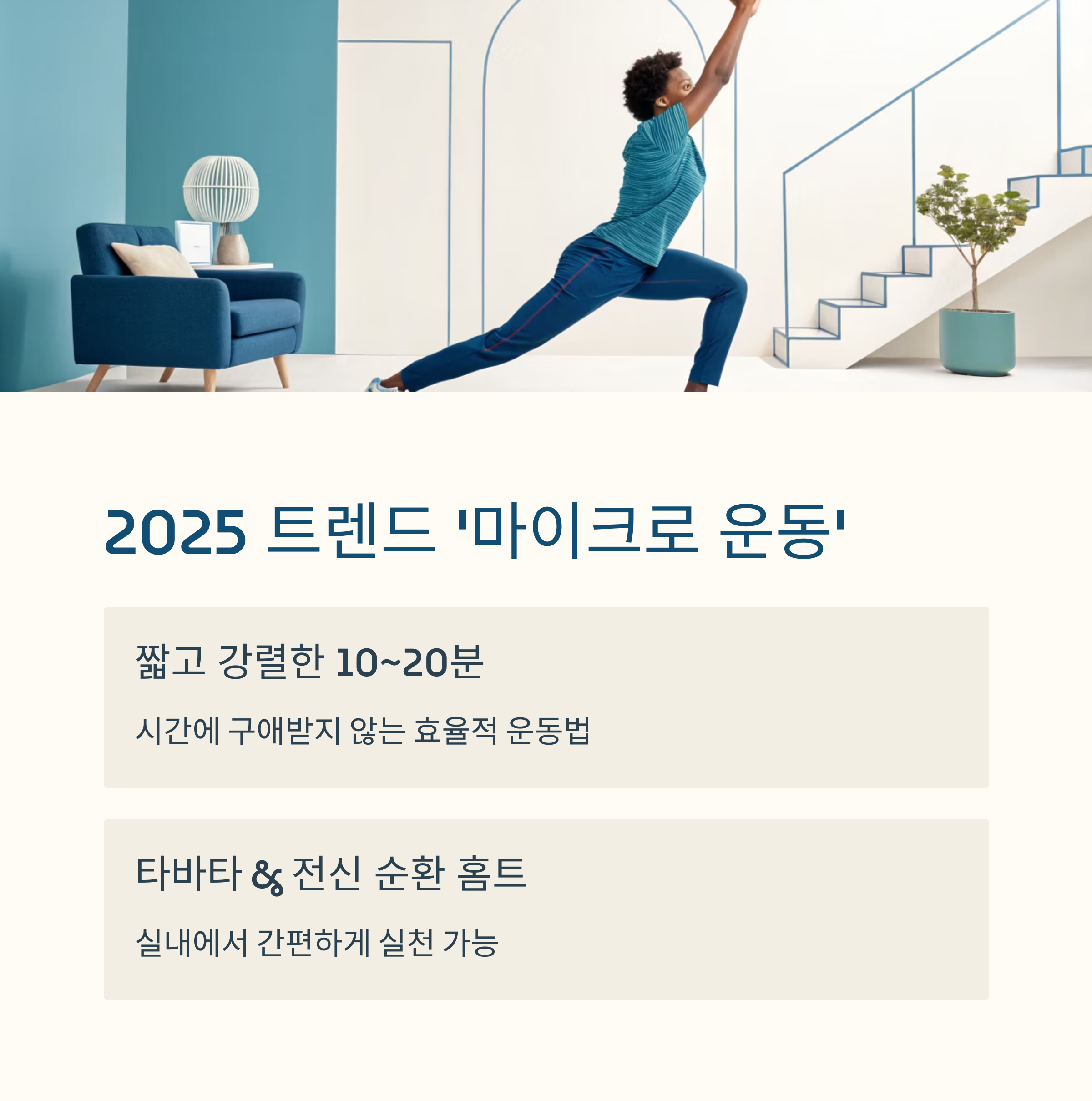 짧고 강렬한 10~20분 운동이 대세입니다. 타바타, 전신 순환 홈트 영상 등을 통해 시간에 구애받지 않고 실내에서 간편하게 운동할 수 있습니다. 하루 10분씩 꾸준히 실천하는 것이 핵심입니다.
