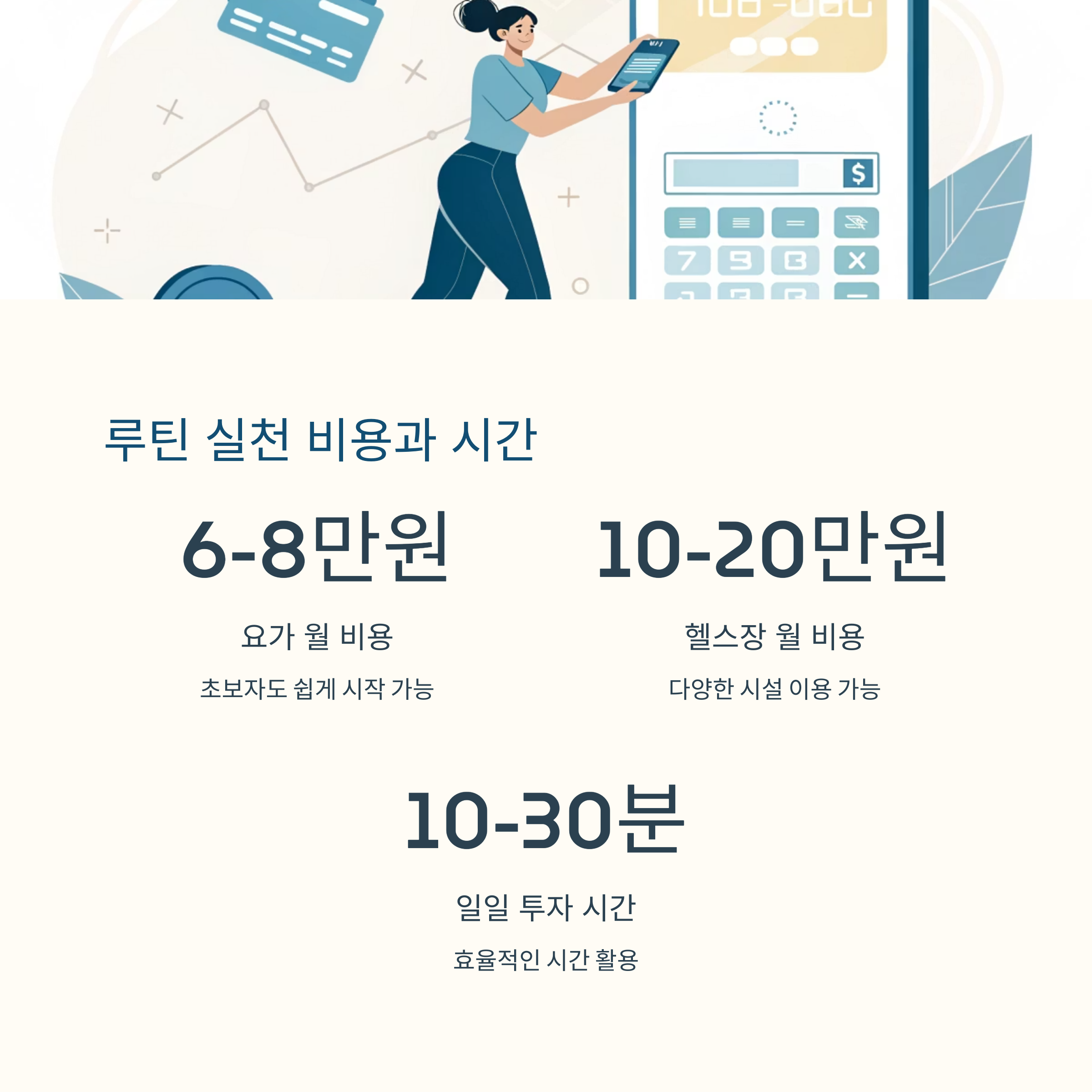 월 평균 비용은 요가 6만8만원, 헬스장 10만20만원 선입니다. 하루 10~30분 정도 투자하면 되며, 초보자도 무리 없이 시작할 수 있는 루틴들로 구성되어 있습니다.