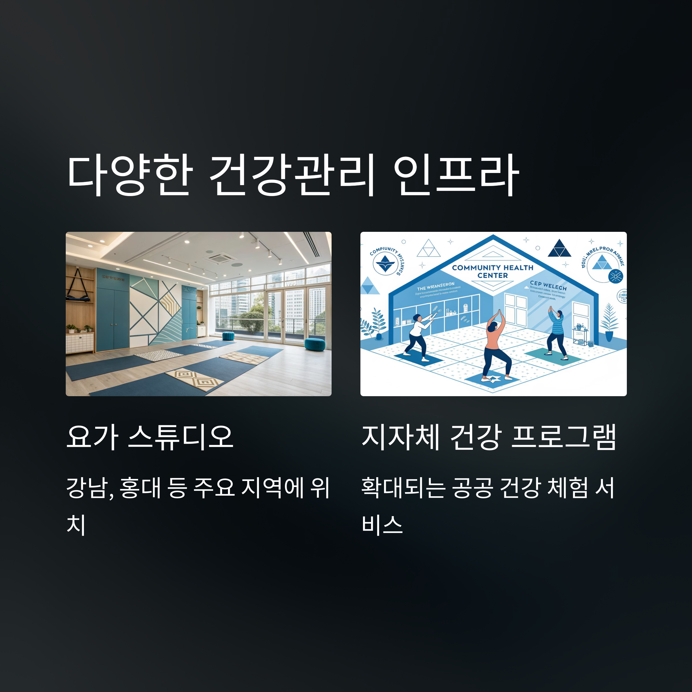 서울 강남, 홍대, 분당 등 주요 지역에는 요가 스튜디오, 헬스장 등 다양한 웰빙 공간이 위치해 있으며, 지자체 운영 건강 체험 프로그램도 확대되고 있습니다.