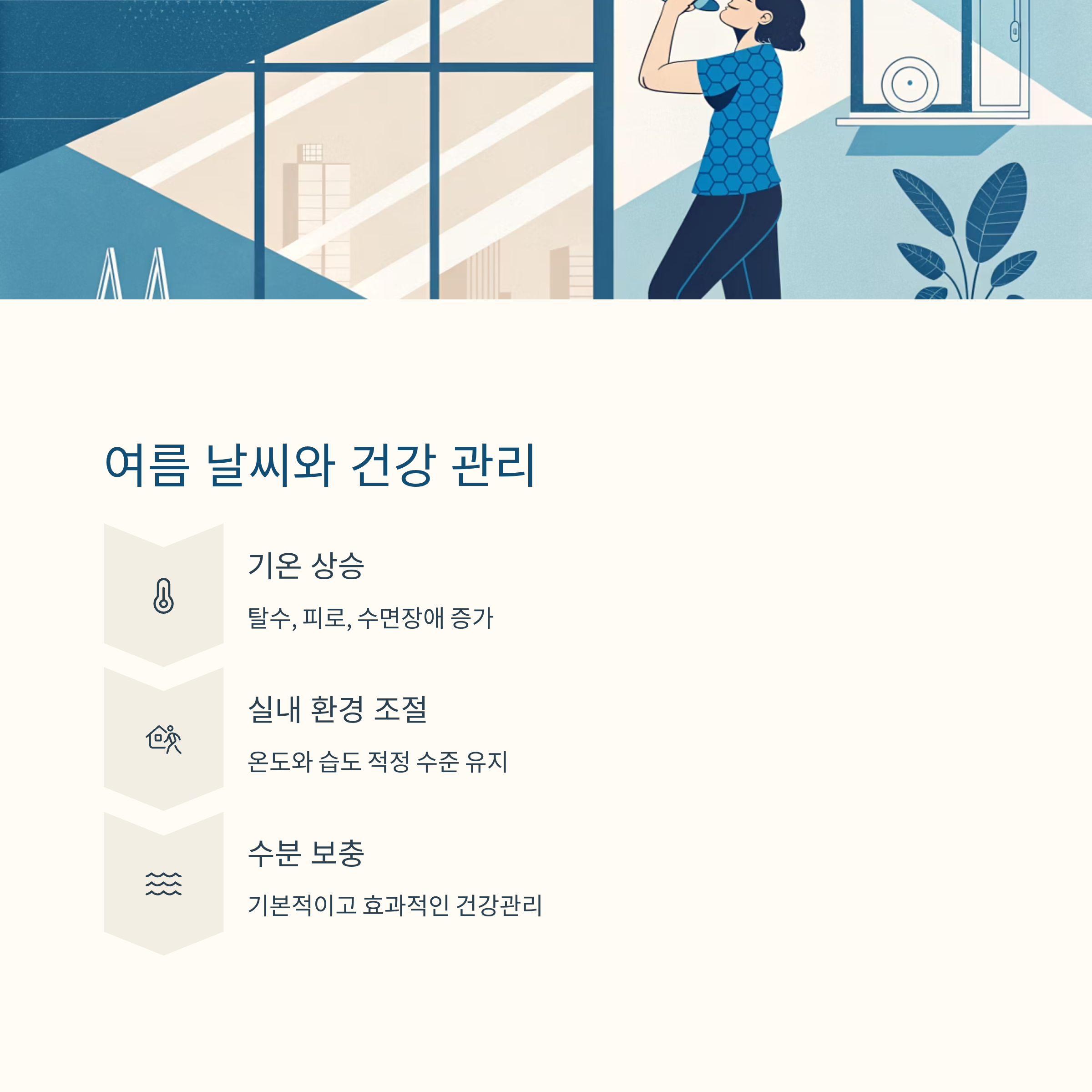 기온이 높아질수록 탈수, 피로, 수면장애가 증가합니다. 실내 온도와 습도 조절, 수분 보충은 가장 기본적이고도 효과적인 건강관리 전략입니다.
