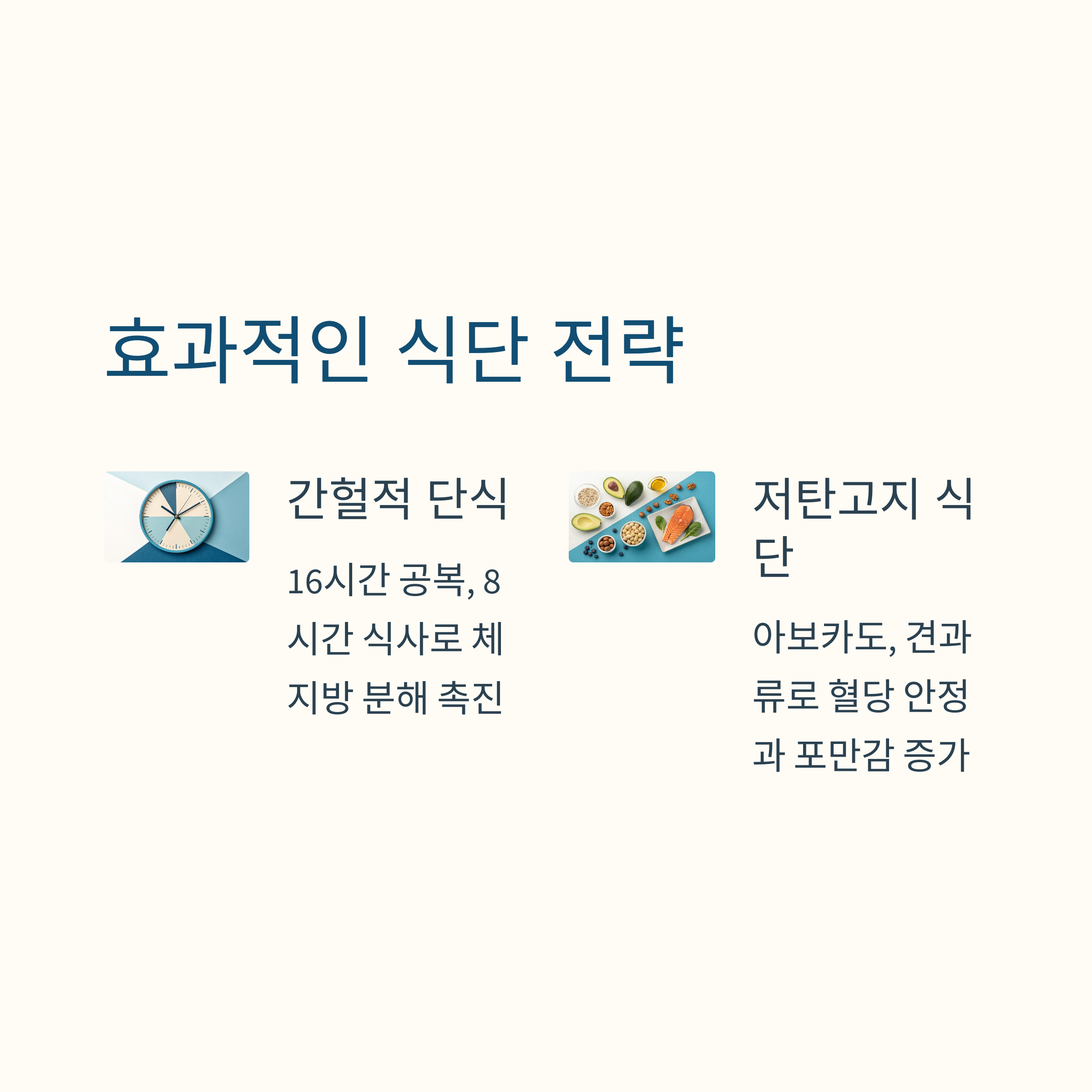 | 간헐적 단식 | 공복 16시간, 식사 8시간 | 체지방 분해 촉진 |