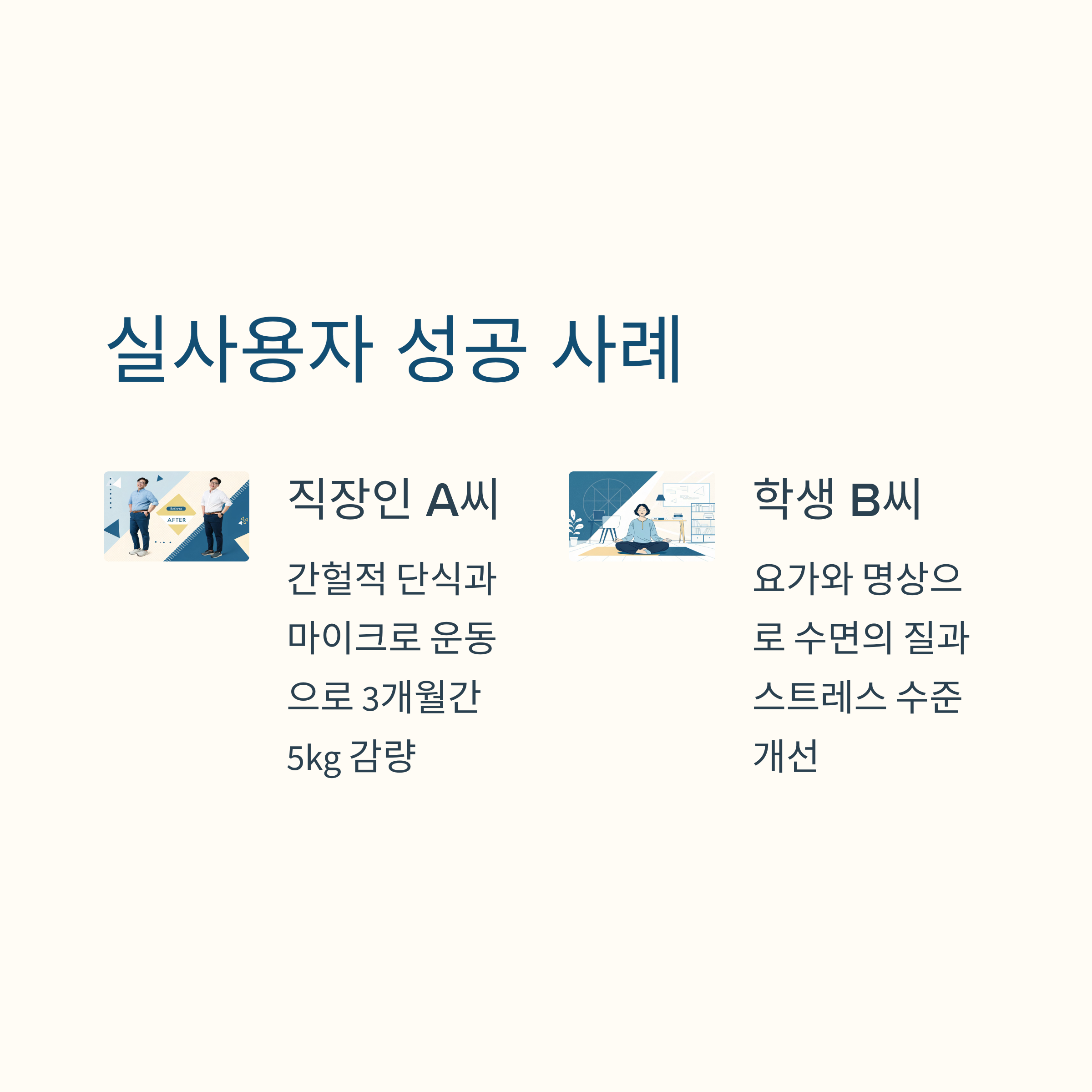 직장인 A씨는 간헐적 단식과 마이크로 운동으로 3개월간 5kg 감량, 학생 B씨는 요가와 명상으로 수면의 질과 스트레스 수준 개선 효과를 체감했다고 합니다.
