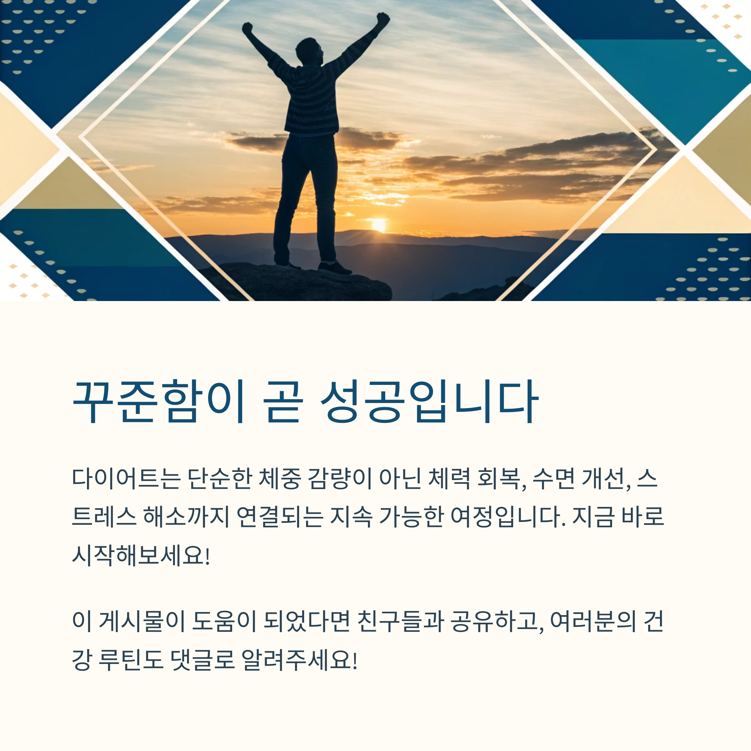 다이어트는 체중 감량 그 이상입니다. 체력 회복, 수면 개선, 스트레스 해소까지 연결되는 지속 가능한 루틴을 지금 시작하세요.