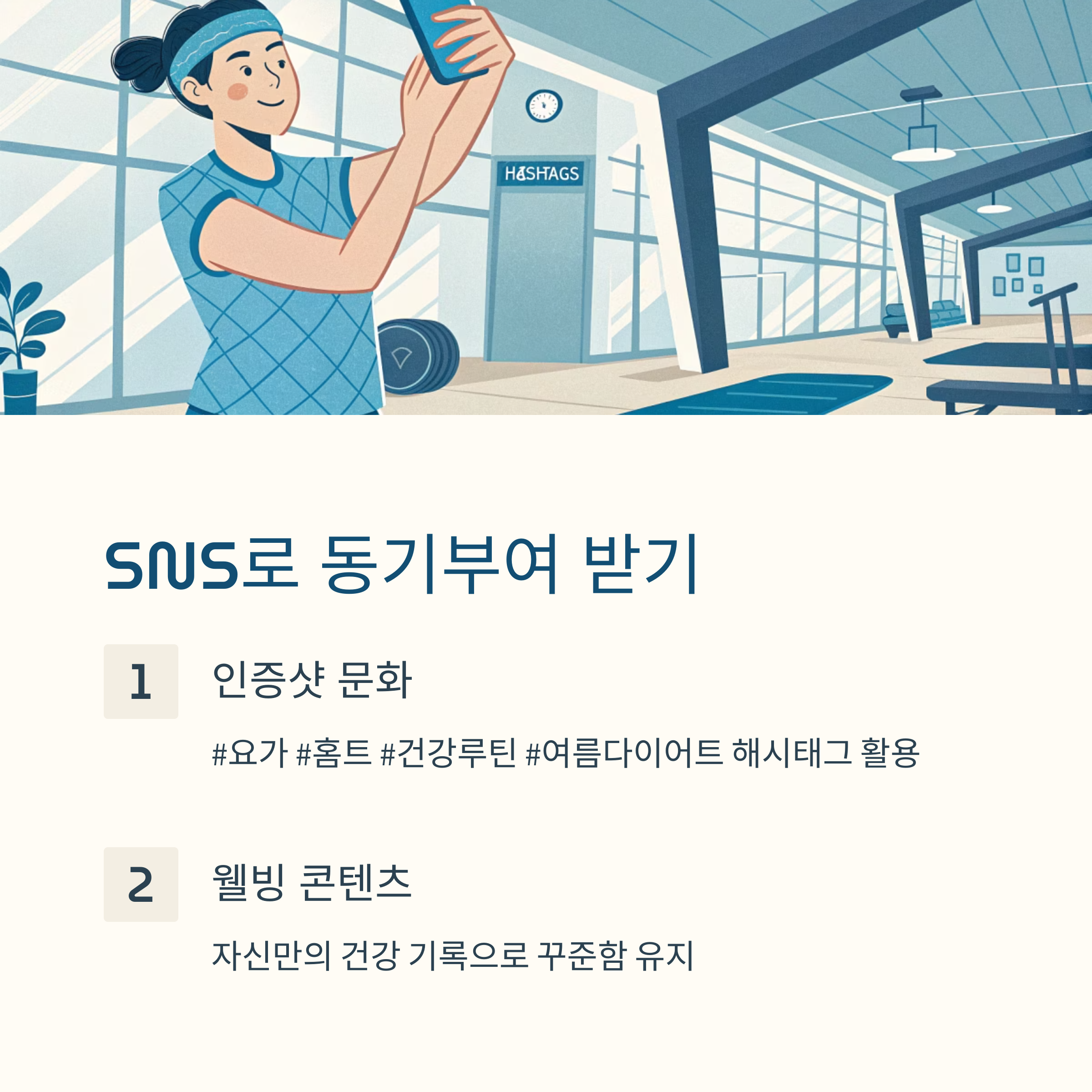 #요가 #홈트 #건강루틴 #여름다이어트 등의 해시태그를 활용한 SNS 인증 문화가 유행 중입니다. 자신만의 웰빙 콘텐츠를 기록하며 꾸준함을 유지해보세요.