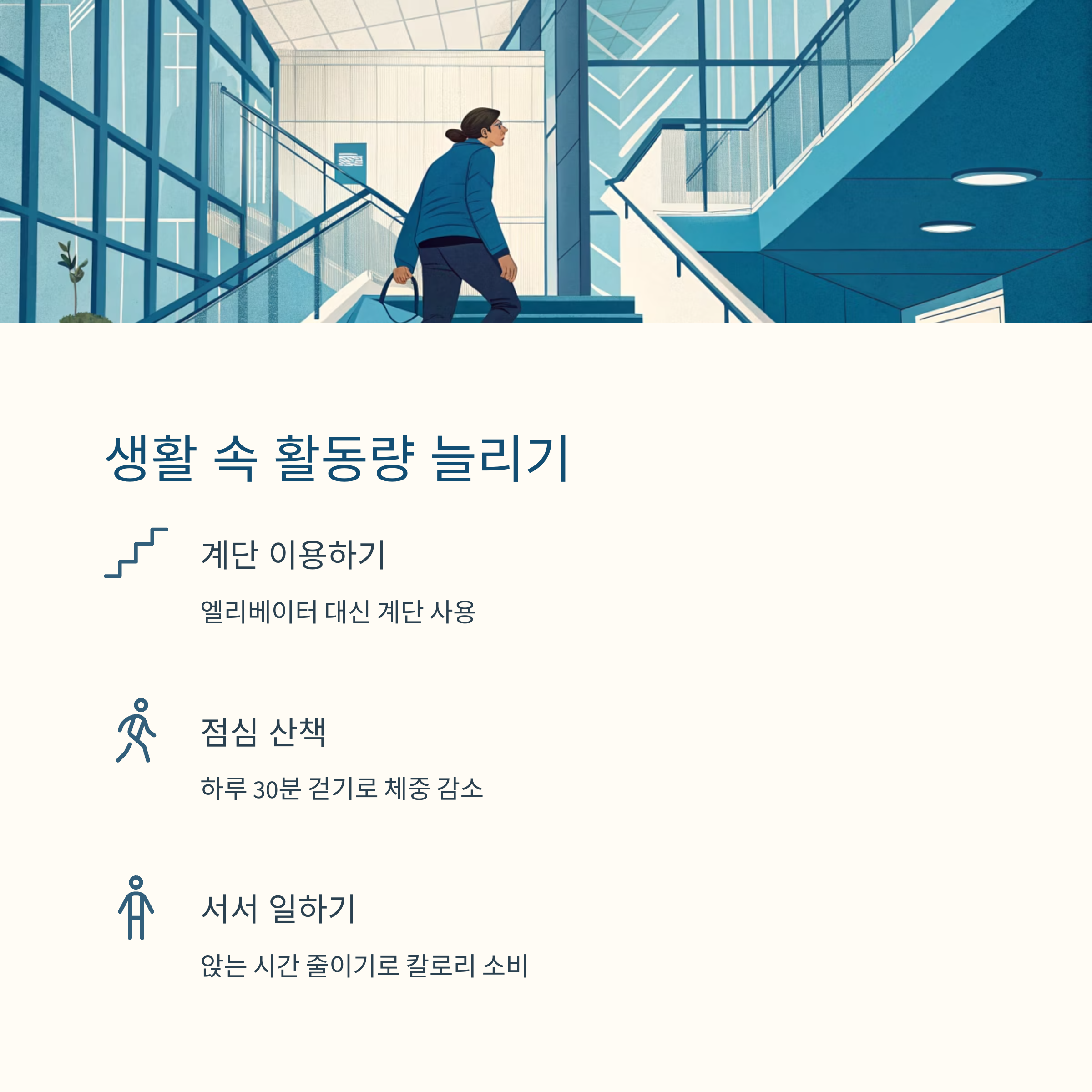엘리베이터 대신 계단, 앉는 시간 줄이기, 서서 일하기, 점심 산책 등 일상의 습관 변화가 칼로리 소비에 큰 영향을 미칩니다. 하루 평균 30분 걷기만으로도 체중 감소에 도움을 줄 수 있습니다.