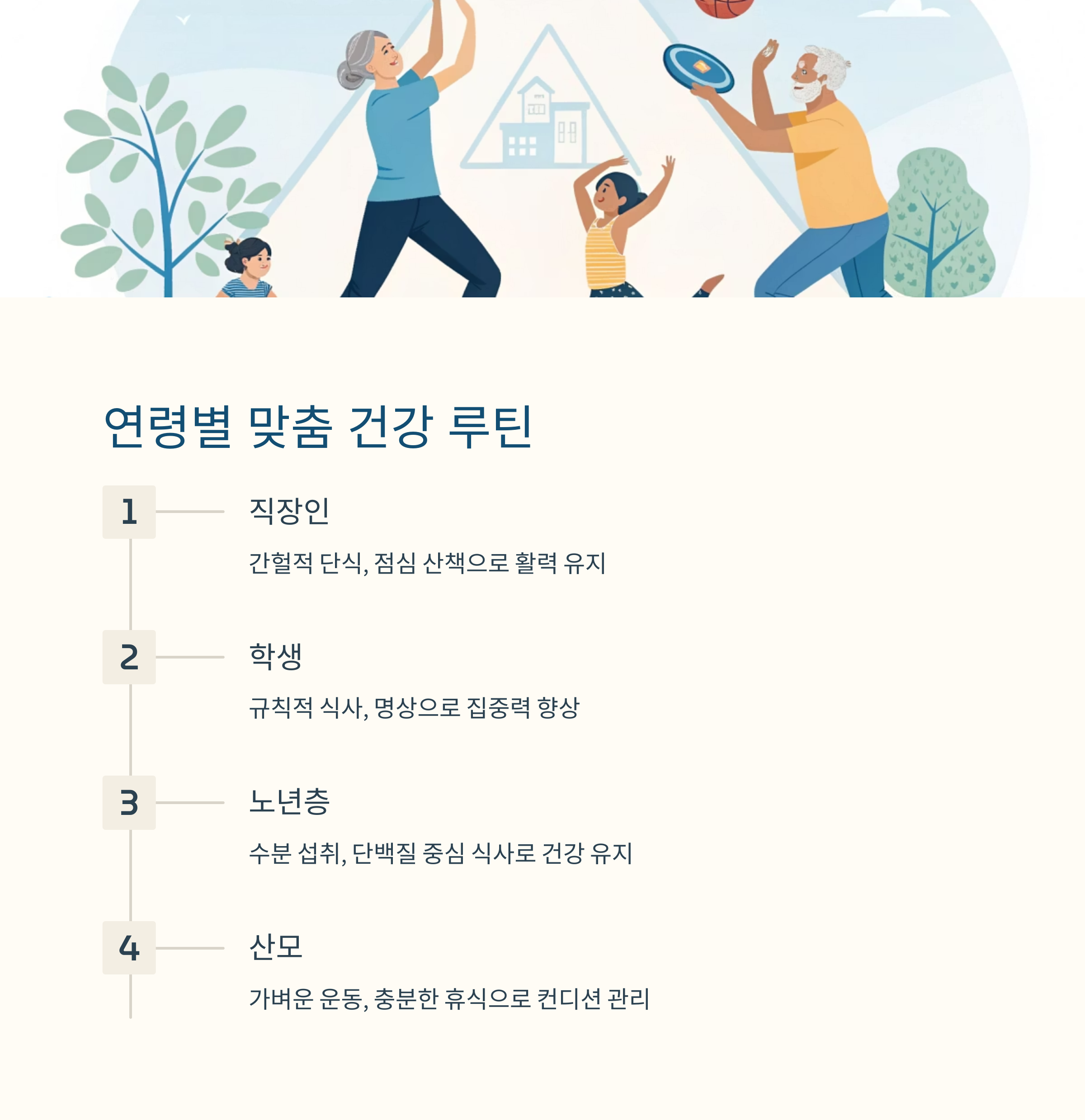 직장인은 점심시간 산책과 스트레칭, 학생은 규칙적인 식사와 명상, 노년층은 수분 섭취와 가벼운 운동, 산모는 영양 보충과 스트레칭이 핵심입니다.