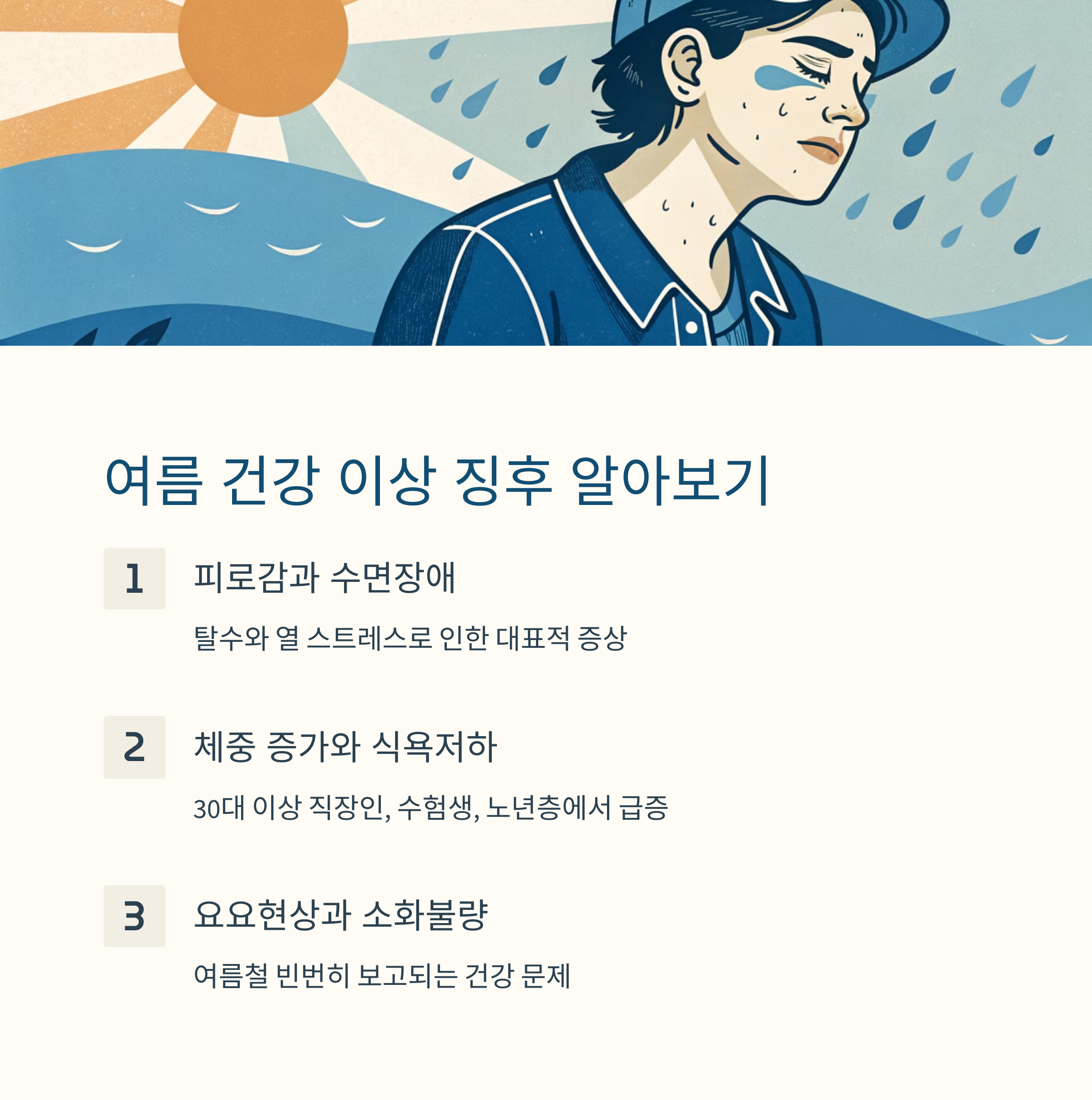여름철 대표적인 증상인 피로감, 수면장애, 체중 증가, 식욕저하는 탈수와 열 스트레스에서 비롯됩니다. 특히 30대 이상 직장인과 수험생, 노년층의 건강 실패 사례가 급증하고 있으며, 요요현상과 소화 불량도 빈번히 보고되고 있습니다.