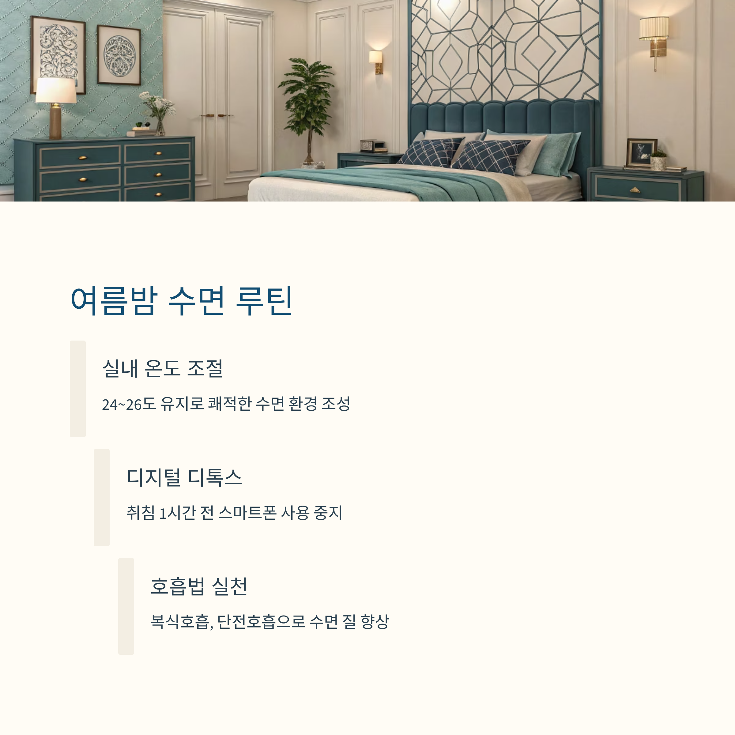 실내 온도는 24~26도, 스마트폰은 취침 1시간 전부터 사용 중지, 복식호흡이나 단전호흡은 수면의 질을 향상시키는 강력한 도구입니다. 하루 5분이라도 꾸준히 실천해보세요.