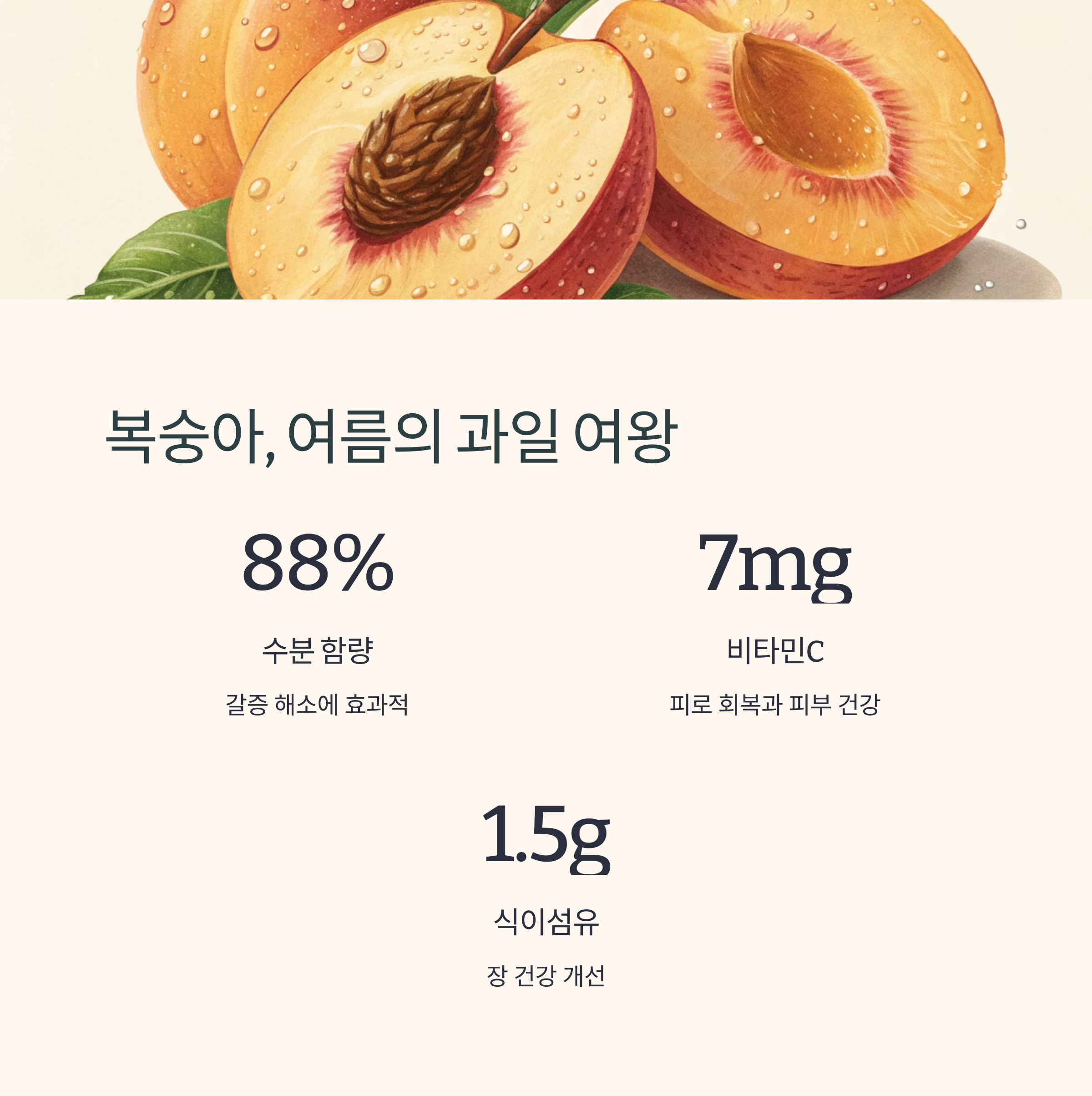 복숭아는 7월 대표 제철 과일로, 수분이 풍부하여 더위에 지친 체내 수분을 보충해줍니다.
