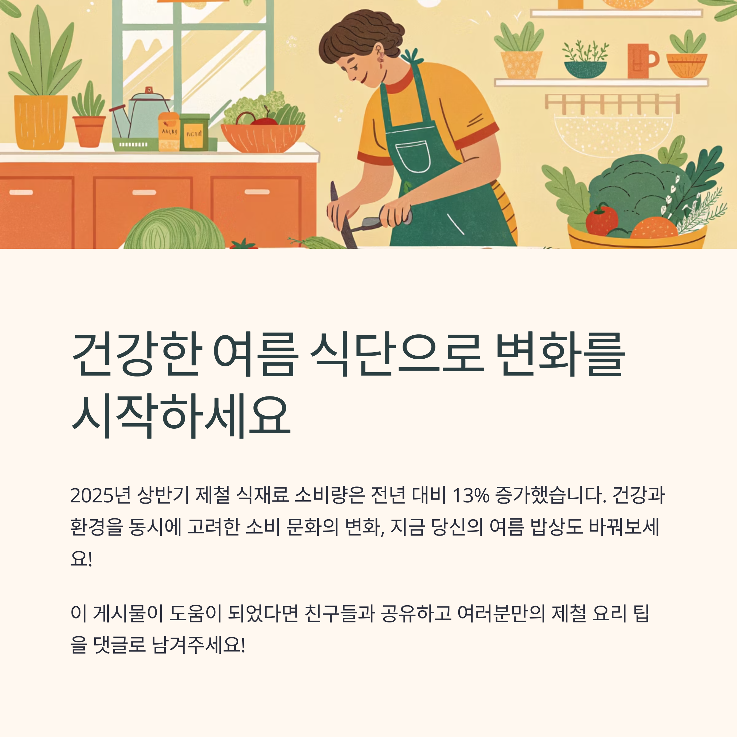 7월은 무더위와 높은 습도로 체력이 급격히 떨어지기 쉬운 시기입니다. 하지만 자연이 주는 선물, 제철 식재료를 활용하면 몸의 균형을 되찾고 피로도 말끔히 해소할 수 있습니다. 이 글에서는 2025년 7월 기준 최신 영양 데이터를 바탕으로 여름철 건강을 책임질 제철 음식과 그 활용법을 소개해 드립니다.