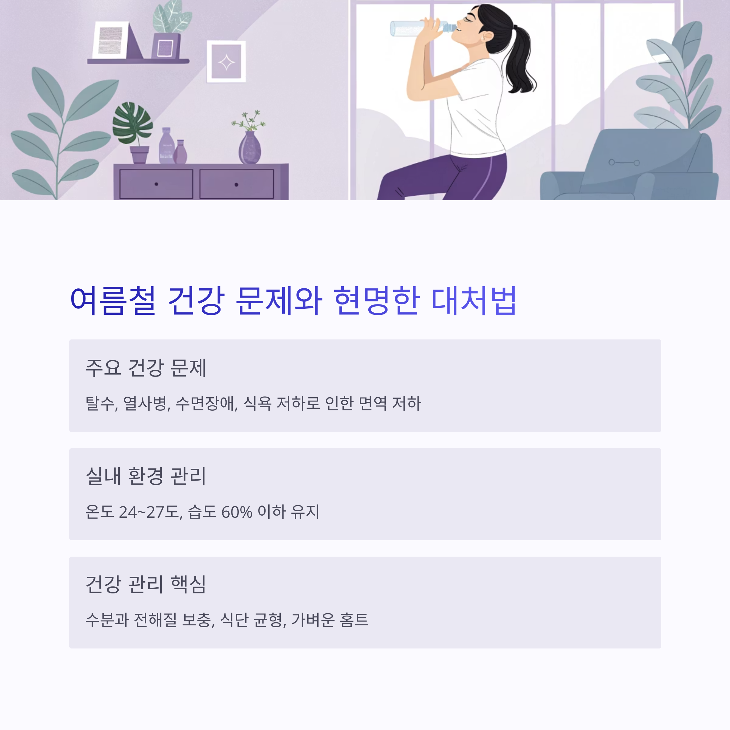 여름철 대표 건강 문제는 탈수, 열사병, 수면장애, 식욕 저하 등입니다.