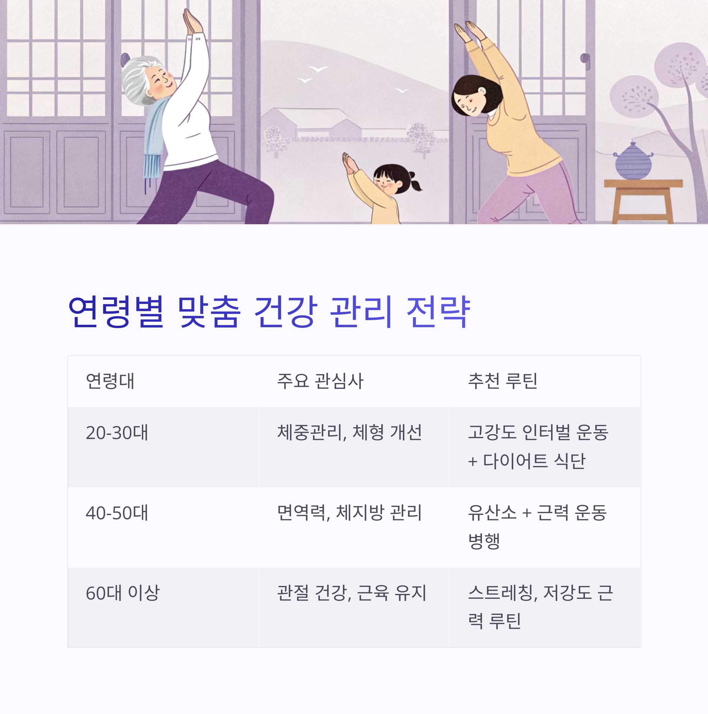 | 60대 이상 | 관절 건강, 근육 유지 | 스트레칭, 저강도 근력 루틴 |