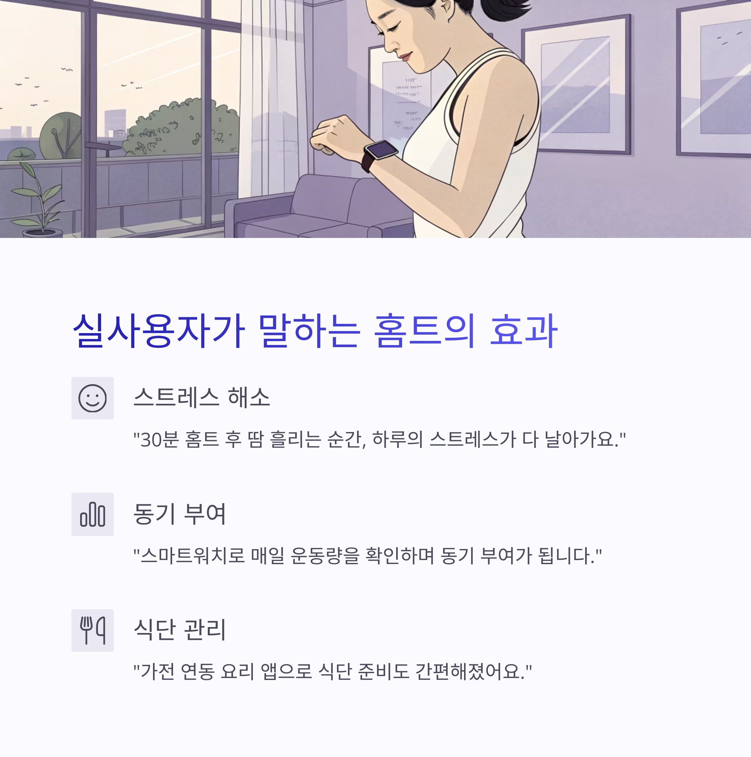"30분 홈트 후 땀 흘리는 순간, 하루의 스트레스가 다 날아가요."