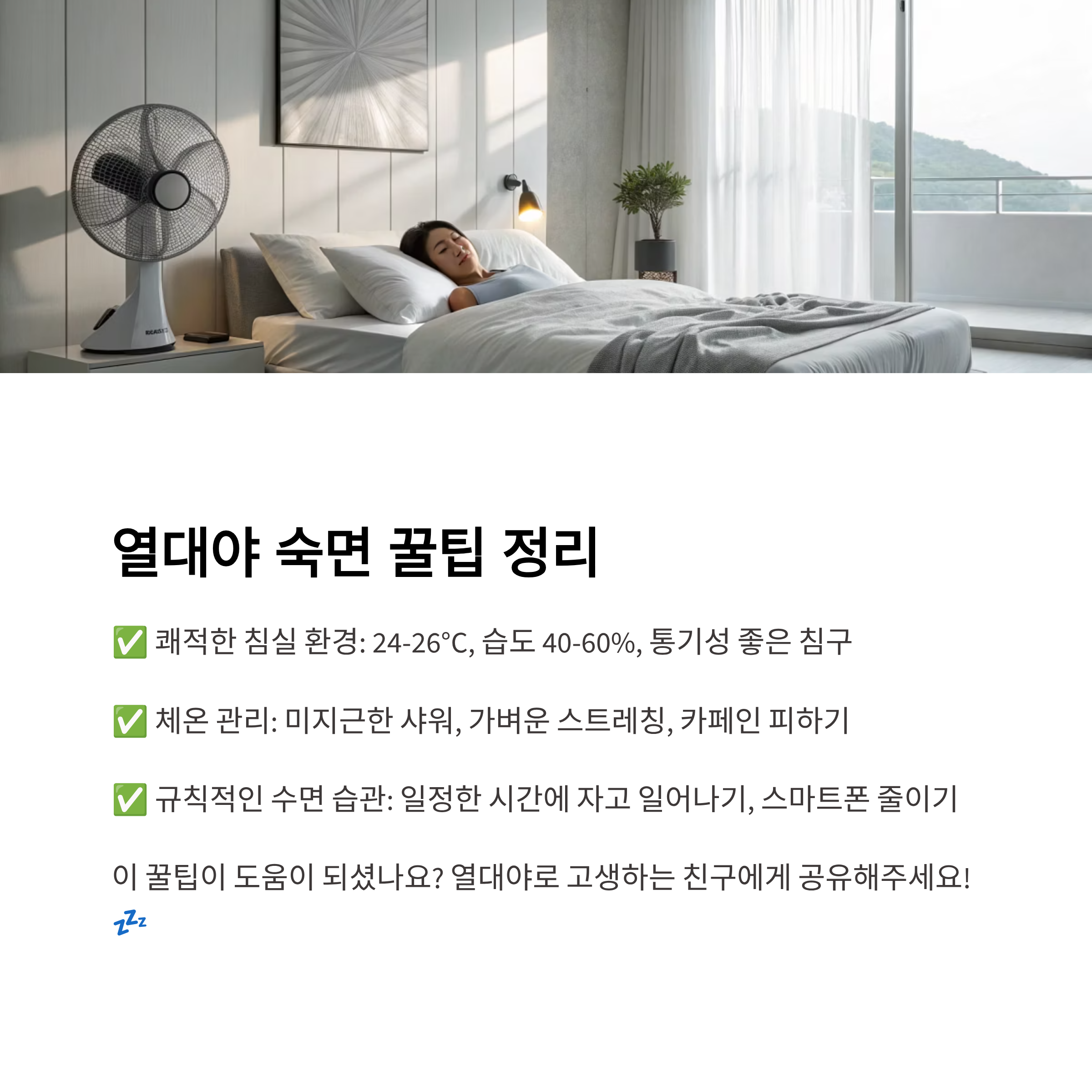 이 글에서 소개해 드린 열대야 숙면 꿀팁 3가지를 다시 한번 정리해 드릴게요.