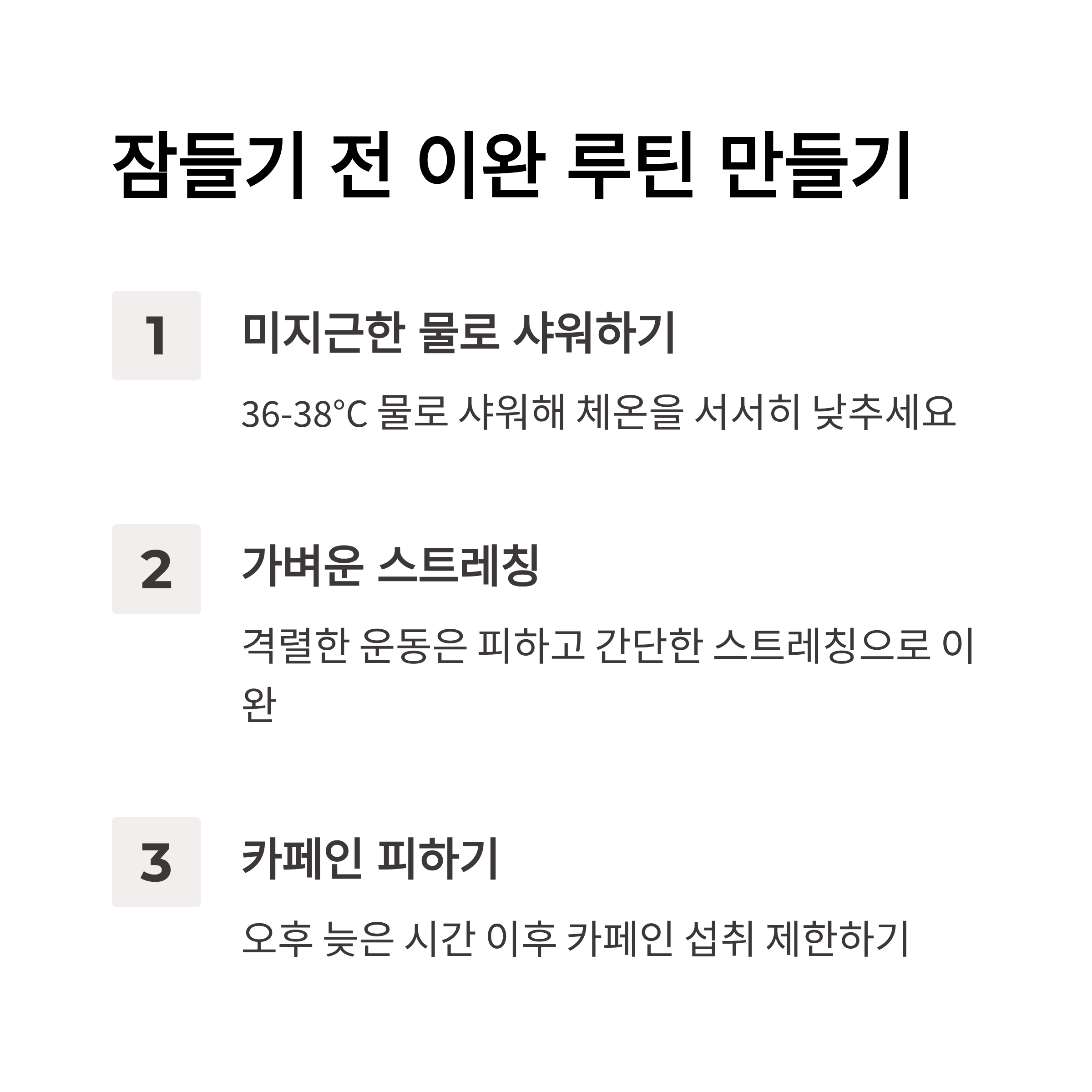 - 체온 관리: 잠들기 1~2시간 전 미지근한 물로 샤워하고, 격렬한 운동과 카페인은 피하세요.