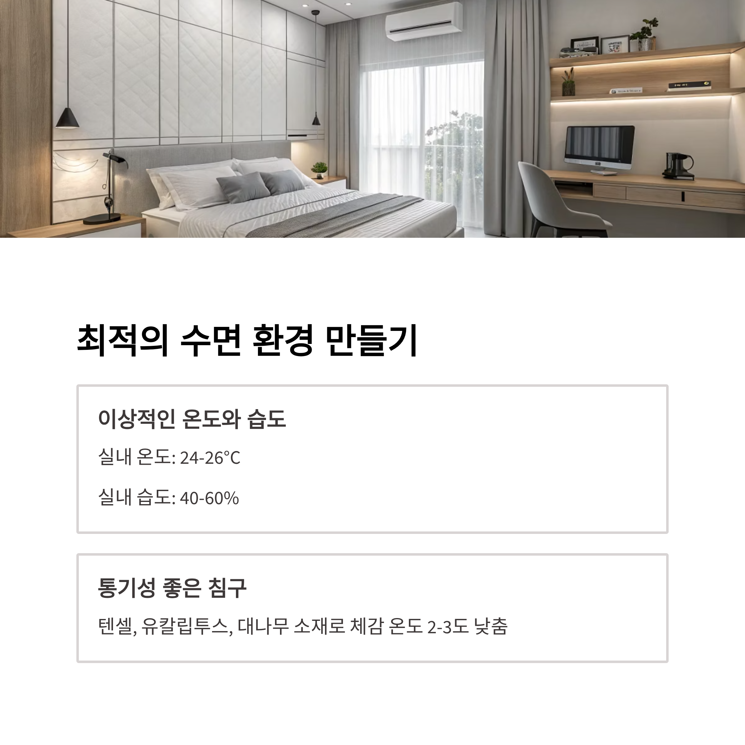 - 쾌적한 침실 환경: 실내 온도 24~26°C, 습도 40~60%를 유지하고 통기성 좋은 침구를 사용하세요.