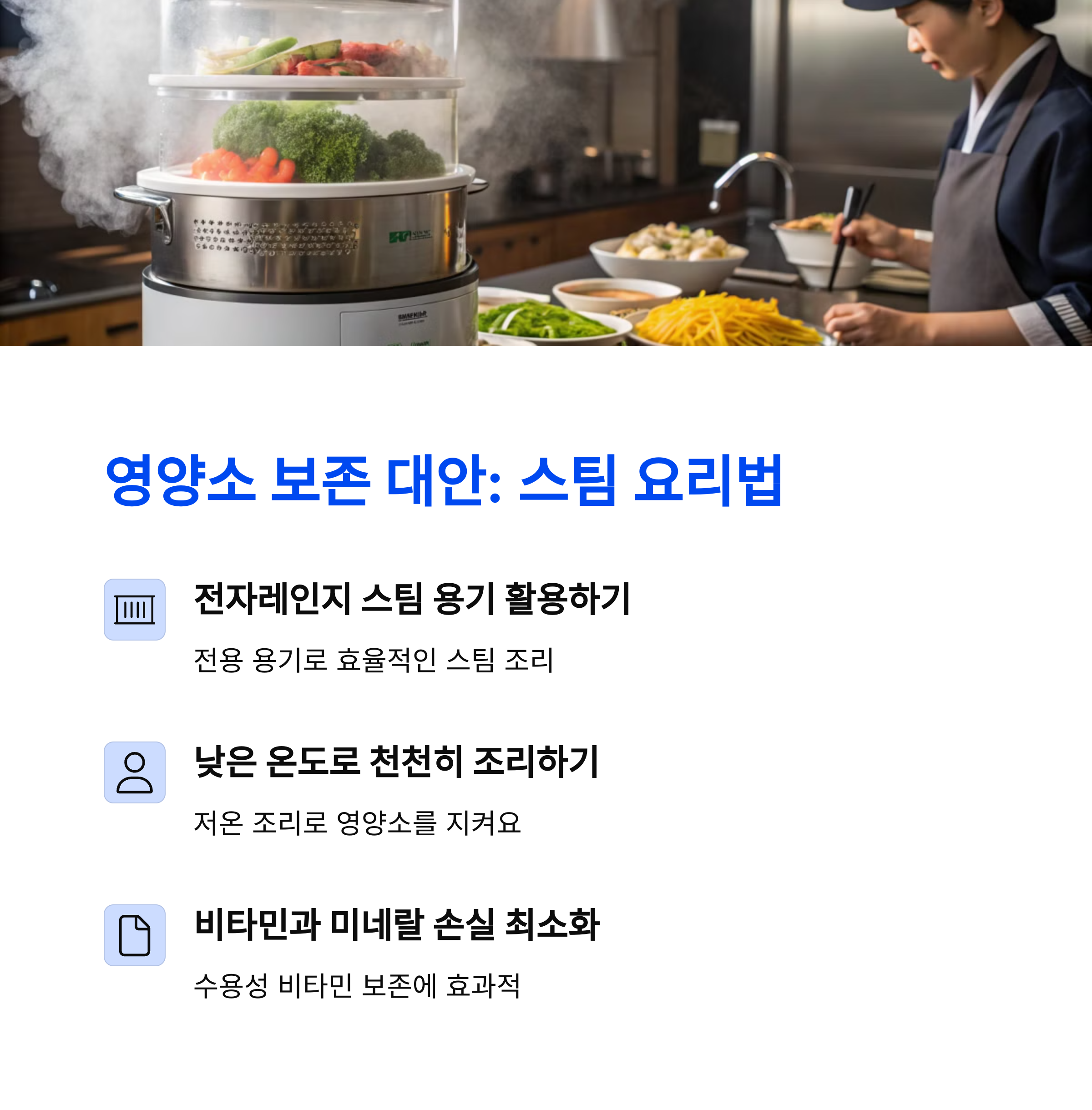 전자레인지 외에도 스팀 요리법은 영양소를 보존하는 좋은 방법입니다. 스팀 요리는 음식이 직접 물에 닿지 않고 수증기로 조리되기 때문에 수용성 비타민의 손실을 최소화할 수 있습니다.