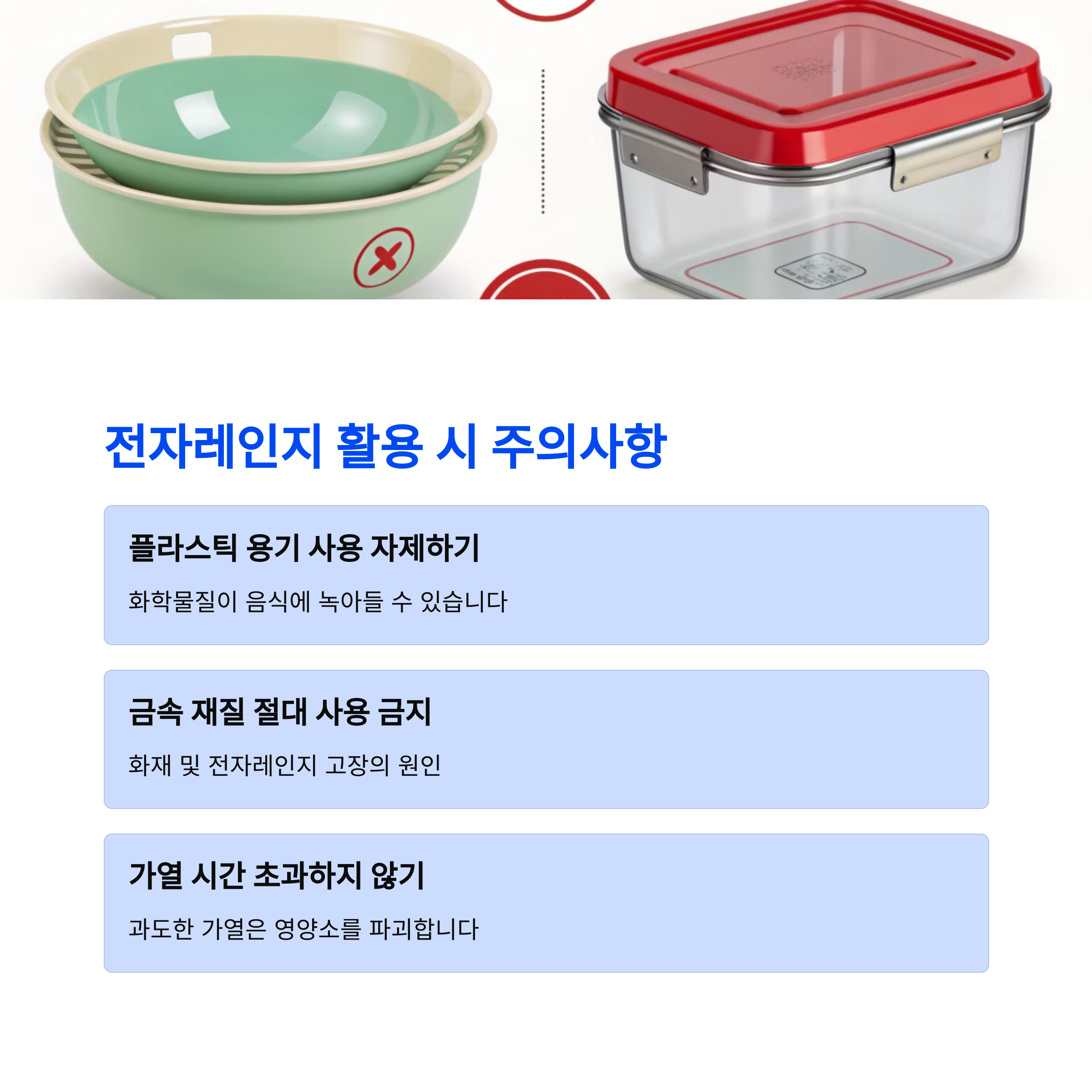 전자레인지 사용 시 용기 선택도 중요합니다. 플라스틱 용기는 가급적 사용하지 않는 것이 좋습니다. 플라스틱에서 유해 물질이 음식으로 용출될 수 있기 때문입니다. 대신 전자레인지 전용 유리 용기나 세라믹 용기를 사용하는 것이 안전하고 효과적입니다.