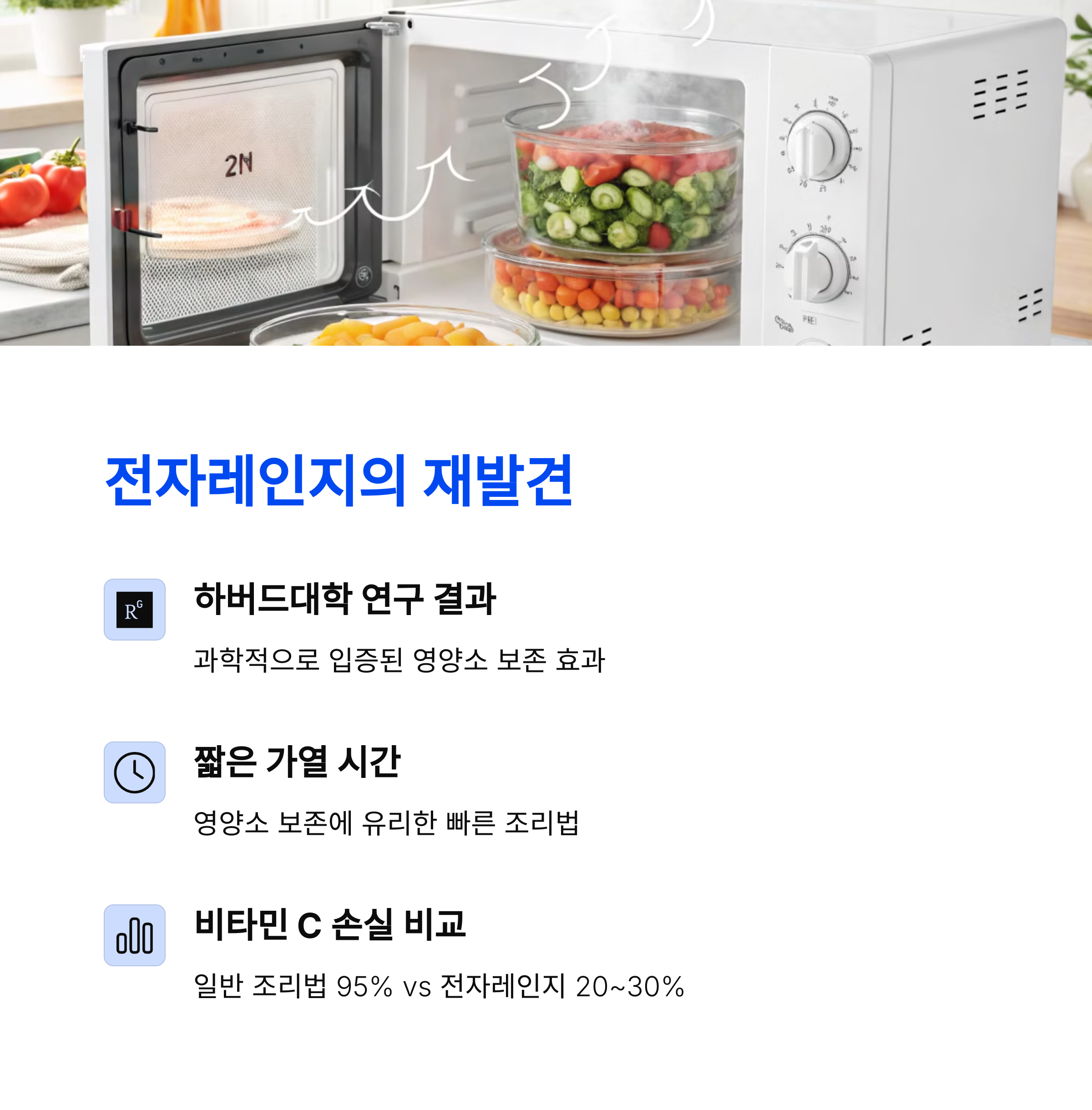 하버드대학 보건대학원의 연구에 따르면, 전자레인지는 다른 조리 방법에 비해 음식을 데우는 시간이 짧아 오히려 비타민 C와 같은 영양소의 파괴가 적다고 합니다.
