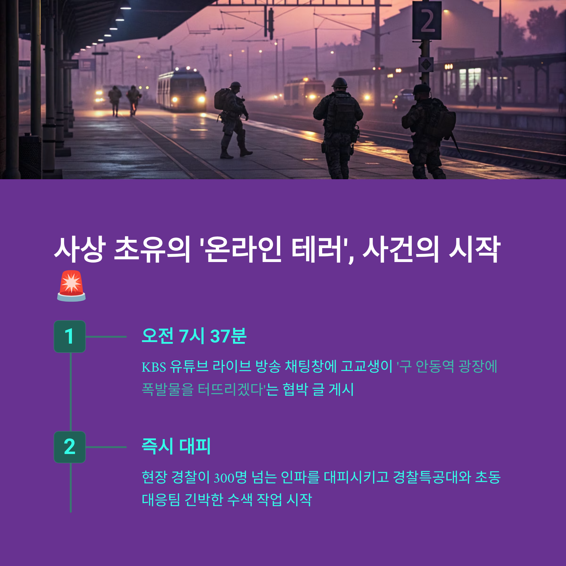 모든 일은 오전 7시 37분, KBS 유튜브 라이브 방송의 채팅창에서 시작됐습니다. 10년 만에 다시 모인 안동역의 풍경이 실시간으로 송출되는 가운데, 한 고교생이 '구 안동역 광장에 폭발물을 터뜨리겠다'는 충격적인 글을 남긴 거죠. 모두가 들뜬 분위기였기에 이 글은 더욱 큰 공포를 불러왔습니다.