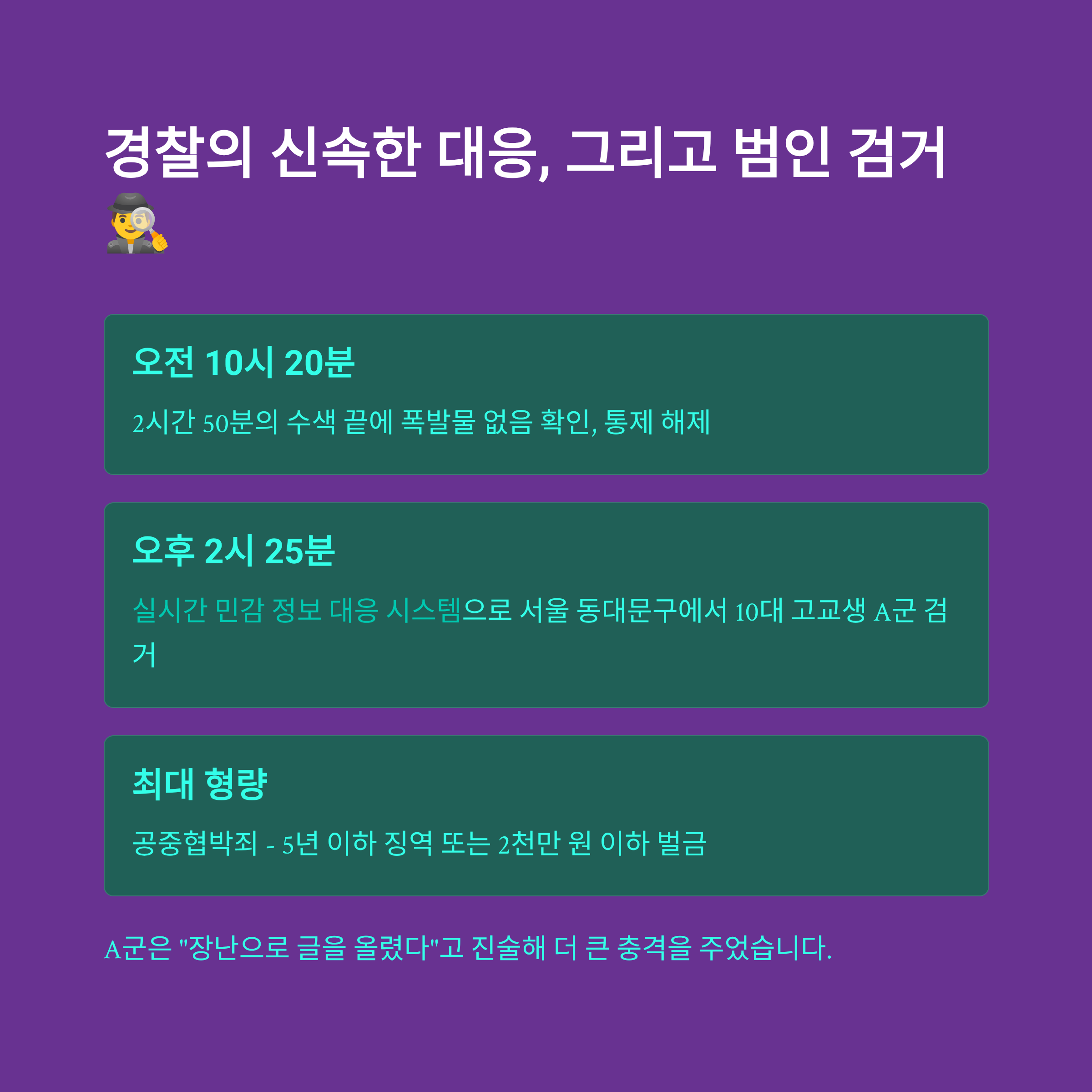 경찰은 온라인 테러 협박 글에 대한 '실시간 민감 정보 대응 시스템'을 가동해 범행 7시간 만인 오후 2시 25분, 서울 동대문구에 위치한 한 가정집에서 10대 고교생 A군을 검거했습니다. 이 시스템은 위협적인 온라인 게시물에 대한 신속한 추적 및 대응을 가능하게 합니다.