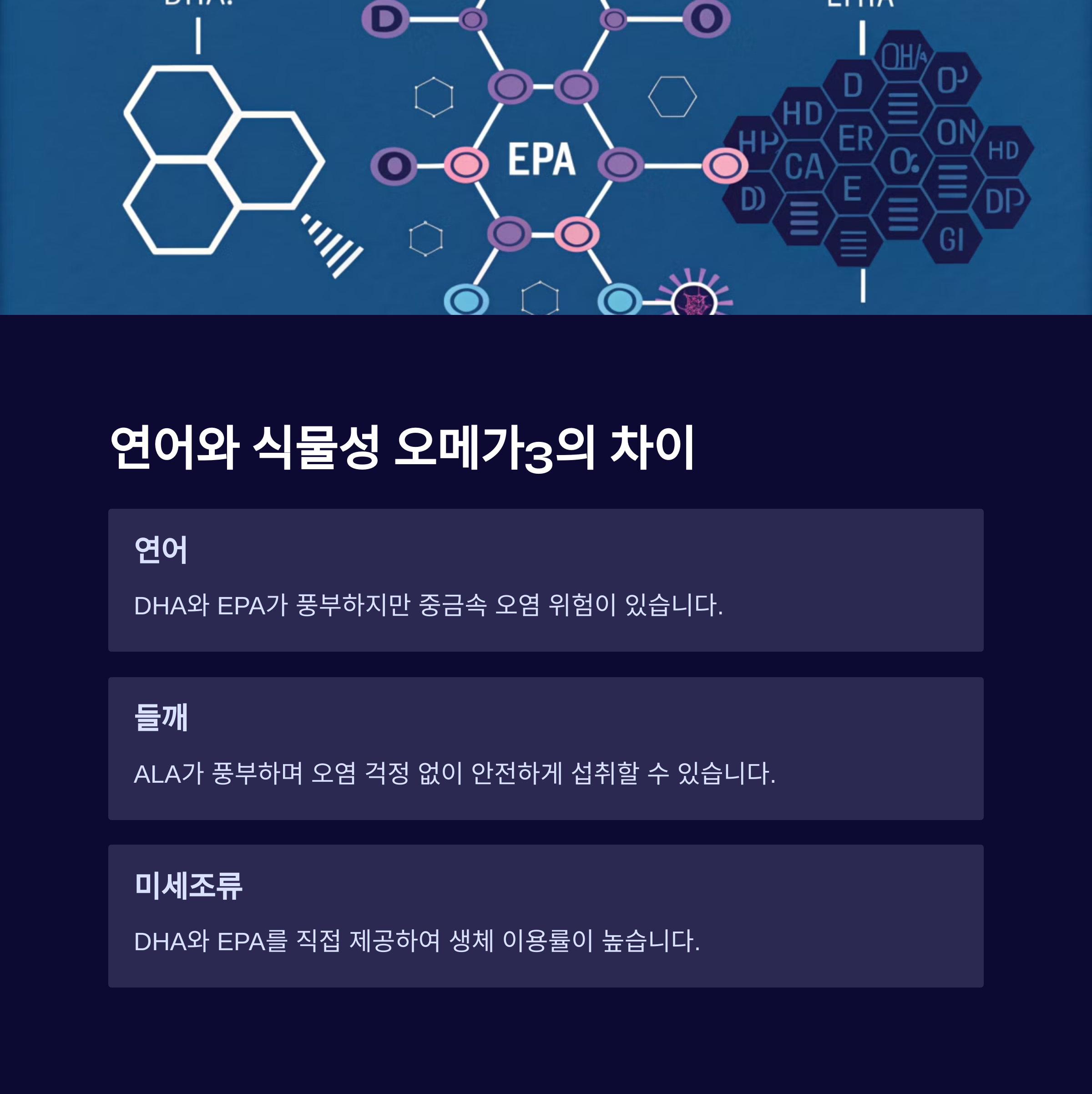 | 오메가-3란? | 불포화 지방산의 일종으로 건강에 매우 중요한 역할 |