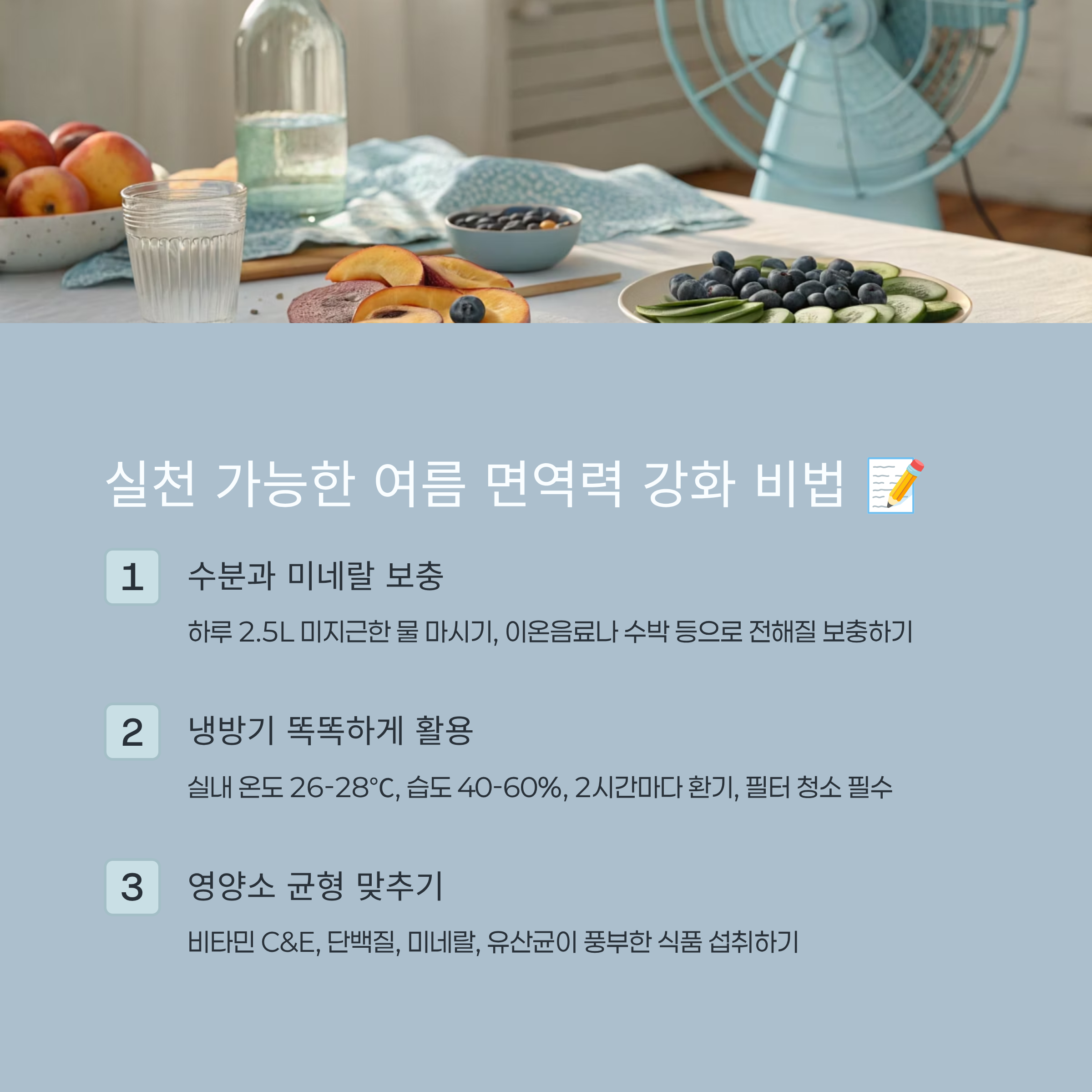 지금까지 여름철 면역력을 지키는 다양한 비책들을 살펴봤어요. 사실 이 모든 것이 거창한 게 아니라, 꾸준히 지켜나가는 작은 습관들이 모여서 큰 차이를 만드는 것 같아요. 올여름은 저도, 이 글을 읽는 여러분도 건강하게 보내셨으면 좋겠어요. 😊