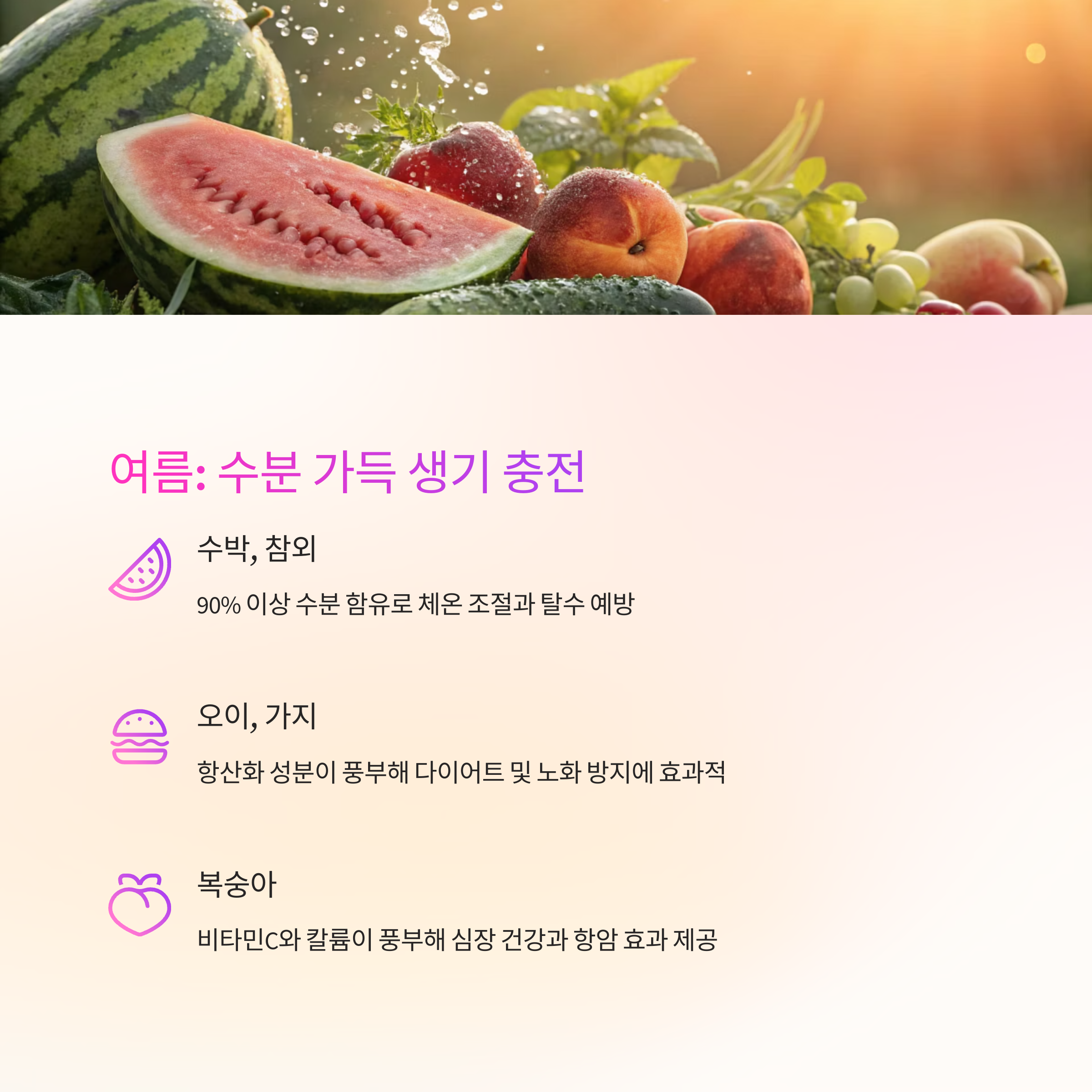 - 이뇨 작용과 포만감: 일부 제철 음식은 부종 예방과 식사량 조절에도 도움을 줍니다.