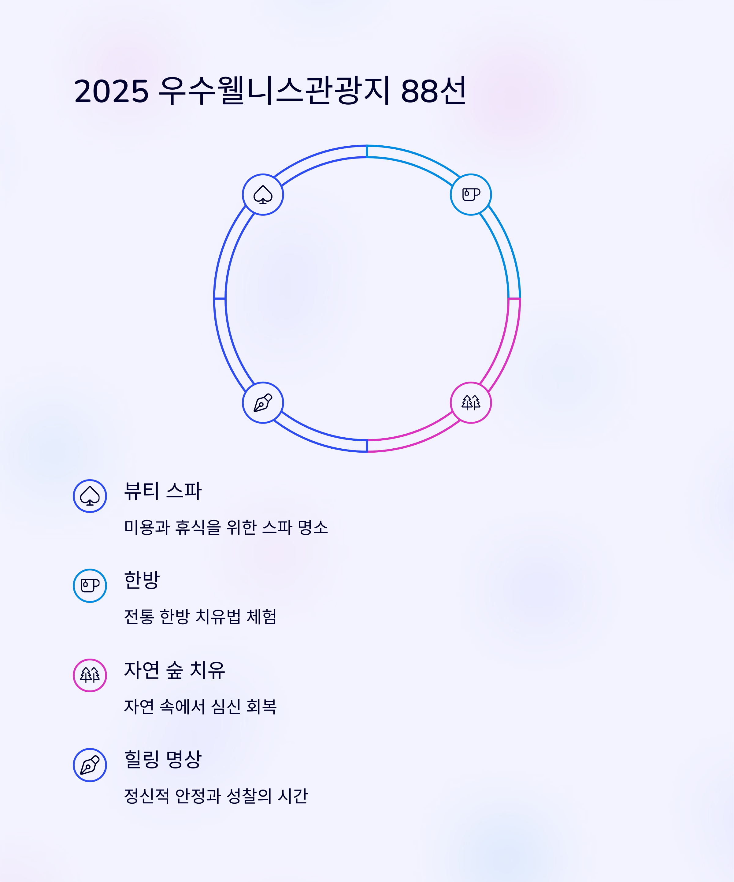특히 2025년에는 한국에서도 "우수웰니스관광지 88선" 이 새롭게 발표되면서, 진정한 힐링을 원하는 분들에게 더욱 다양한 선택지가 열렸습니다.