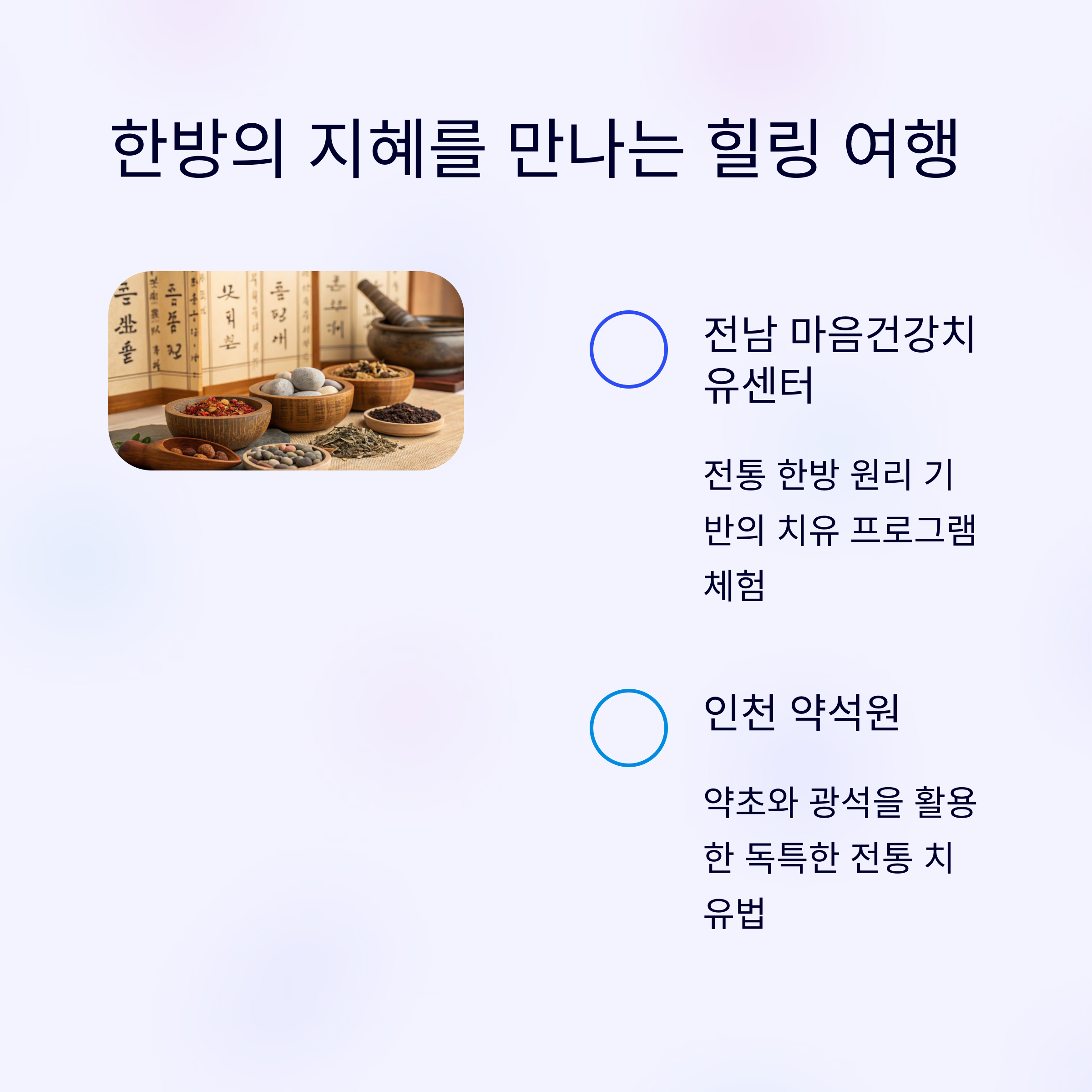 오랜 한의학 전통을 기반으로 한 치유 체험을 선사합니다.