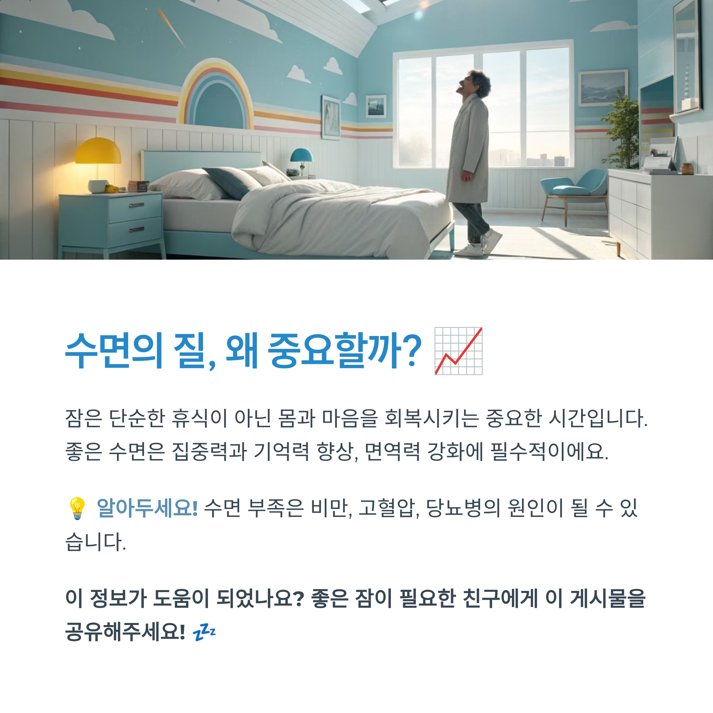 수면 부족은 비만, 고혈압, 당뇨병 등 다양한 질병의 원인이 될 수 있습니다. 잠을 충분히 자는 것만으로도 건강을 지킬 수 있어요.