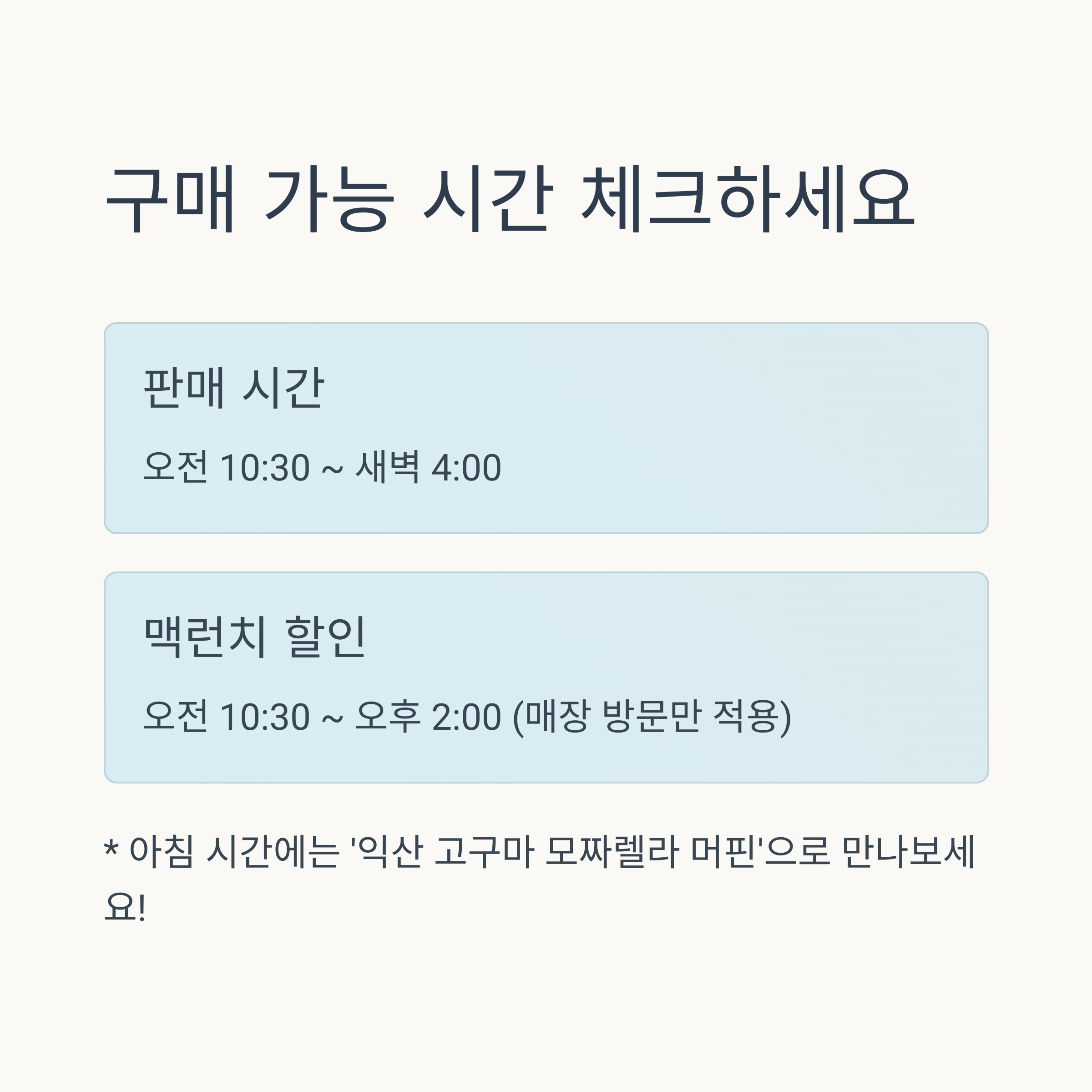 이외 시간에는 익산 고구마 모짜렐라 머핀이라는 아침 메뉴가 별도로 운영됩니다.