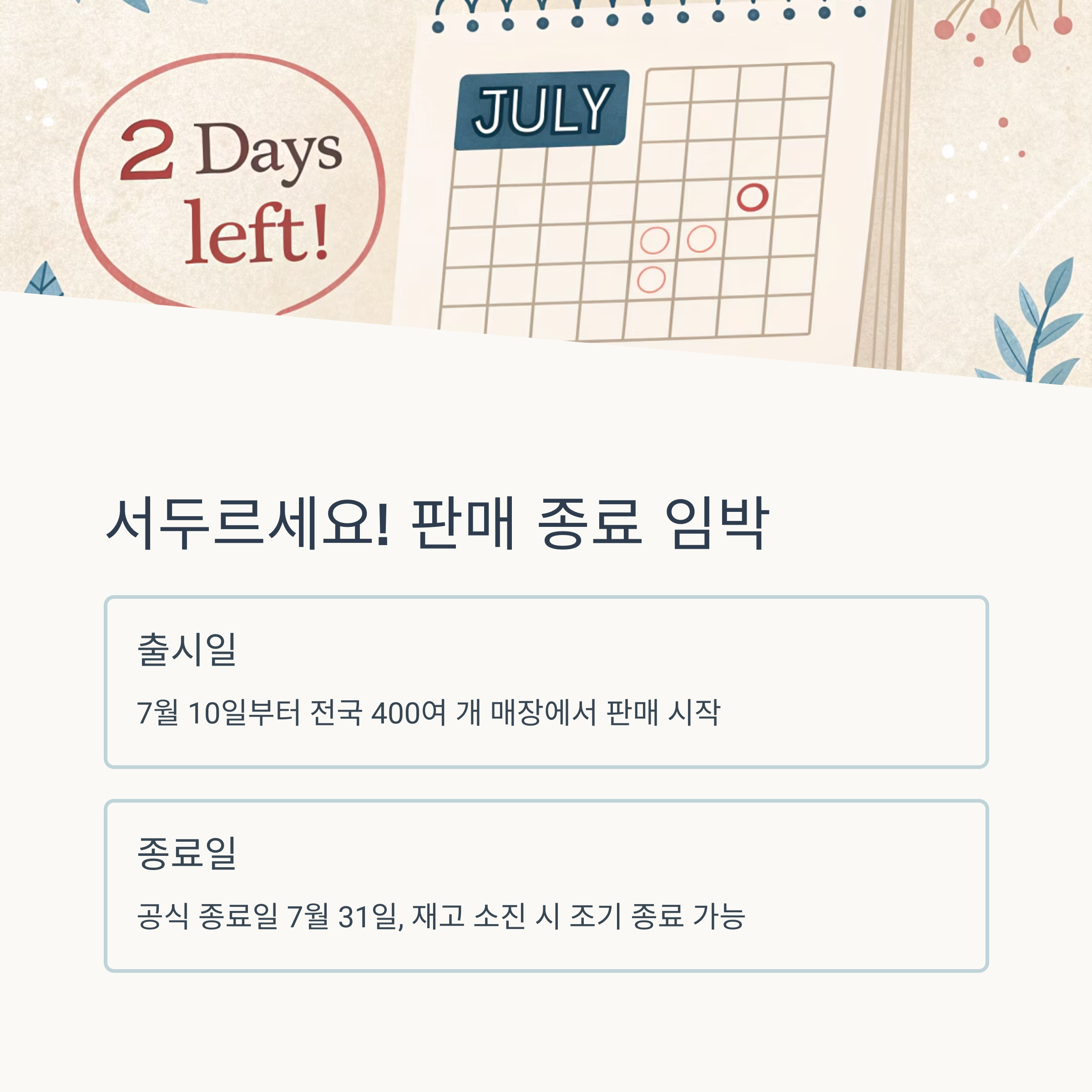 공식 종료일은 7월 31일로 알려졌으나, 매장별로 재고가 조기 소진될 수 있어 구매를 서두르는 것이 좋습니다.