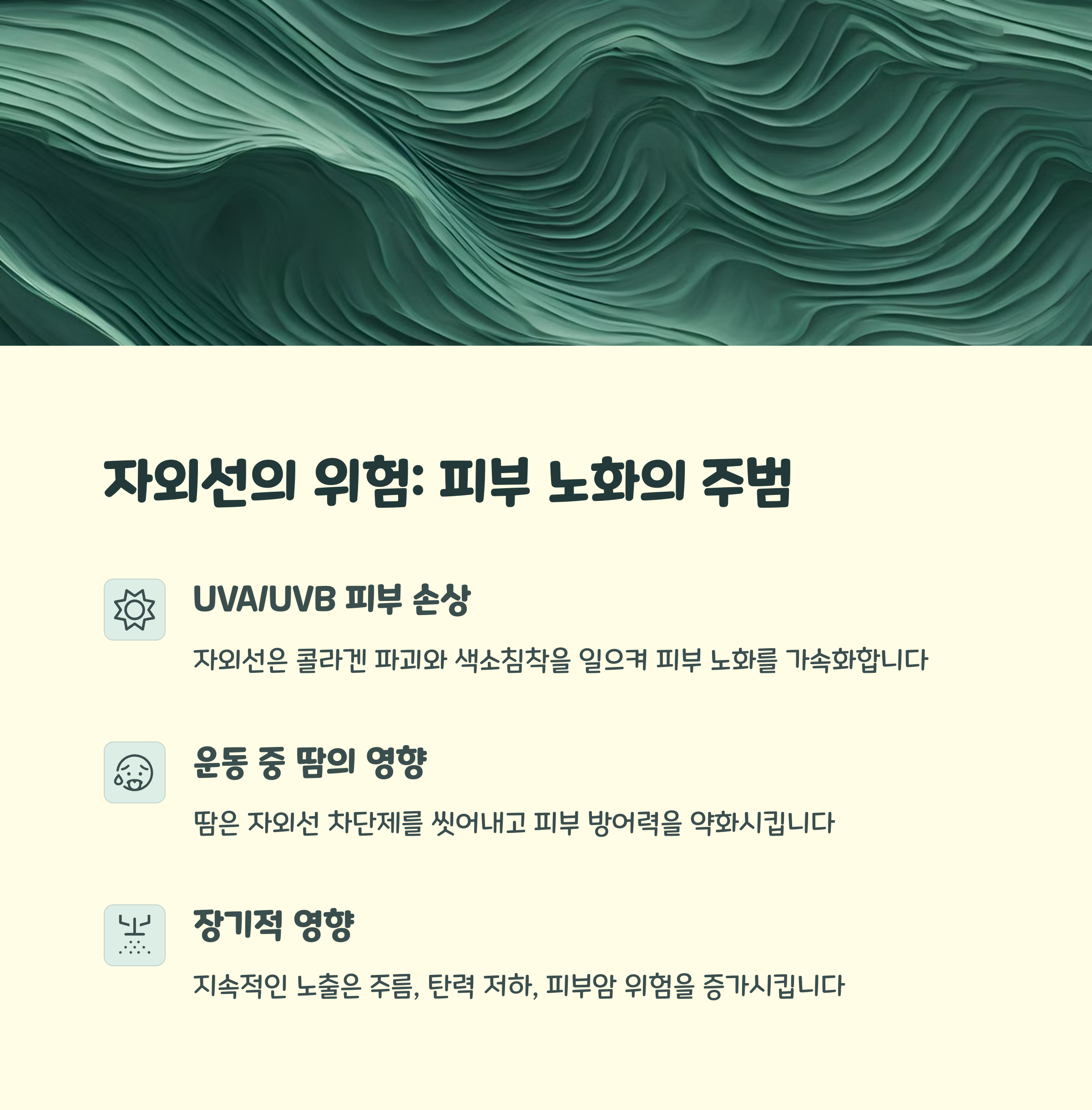 자외선에 과도하게 노출되면 멜라닌 색소가 과도하게 형성되어 기미, 주근깨 같은 색소침착이 발생하고, 콜라겐을 분해하는 MMP 효소가 증가해 주름을 깊게 만듭니다. 특히 운동을 하면 땀으로 인해 자외선 차단제가 흘러내리기 쉬워 피부가 더 취약해질 수 있어요.