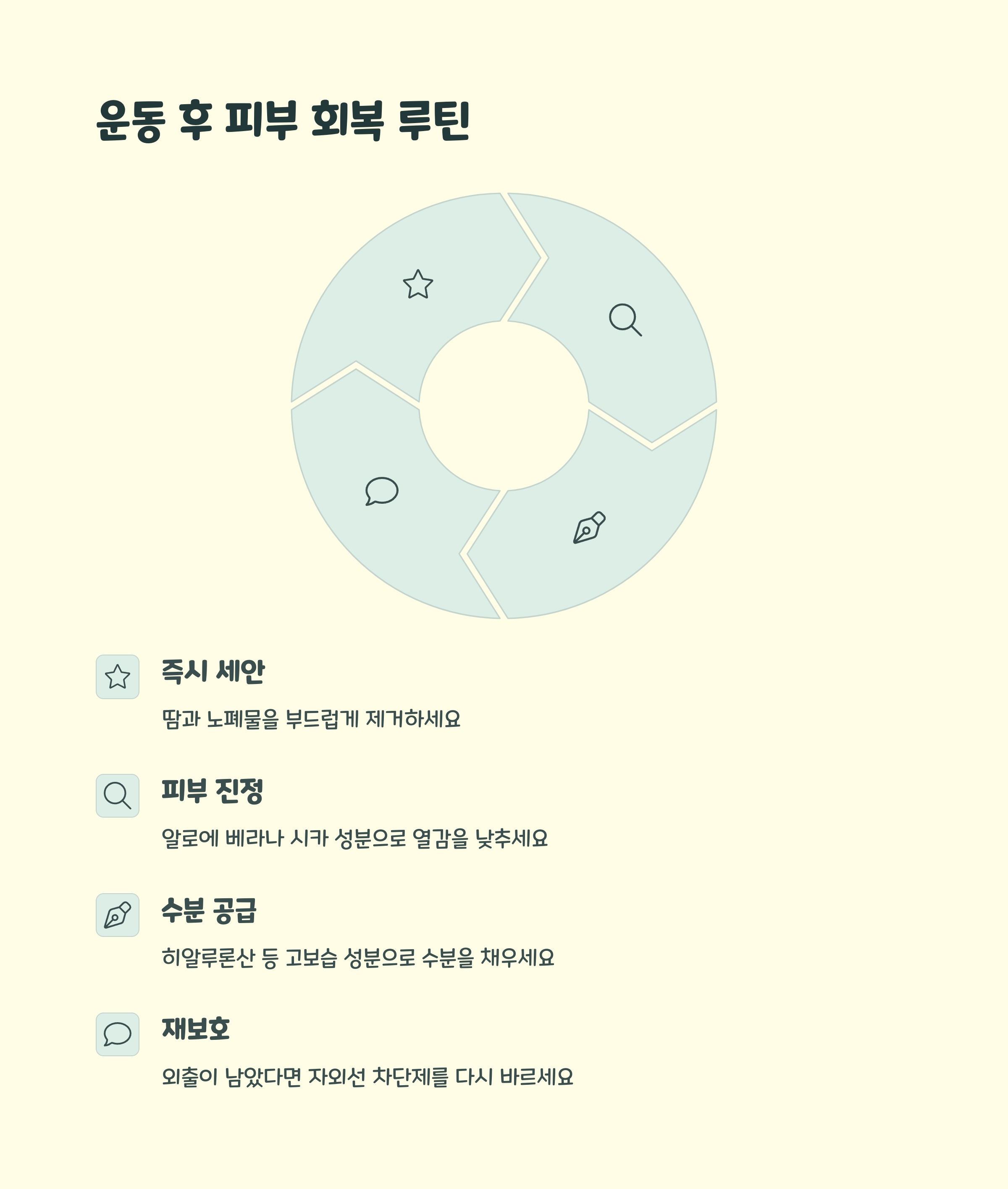 - 운동 후에는 즉시 세안하고 평소 사용하는 나이트 루틴을 진행하세요.