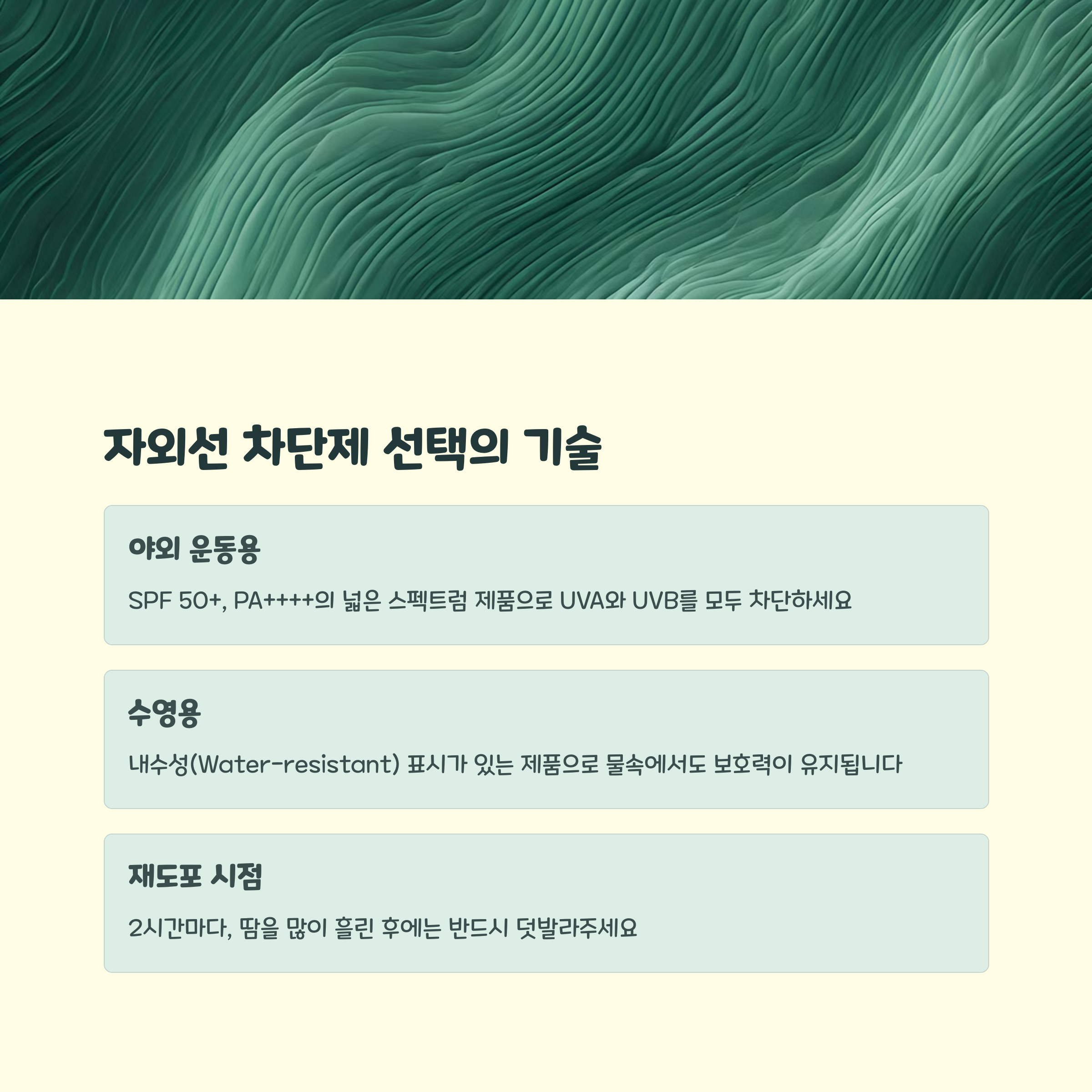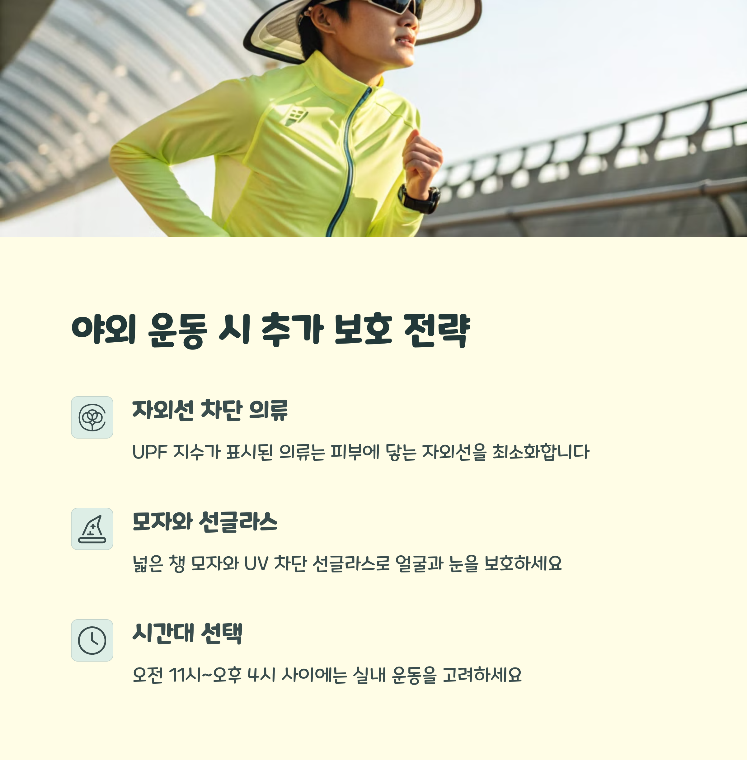 - 야외 운동 시: SPF 30 이상, UVA/UVB 동시 차단 제품을 선택하고, 2시간마다 덧발라주세요.