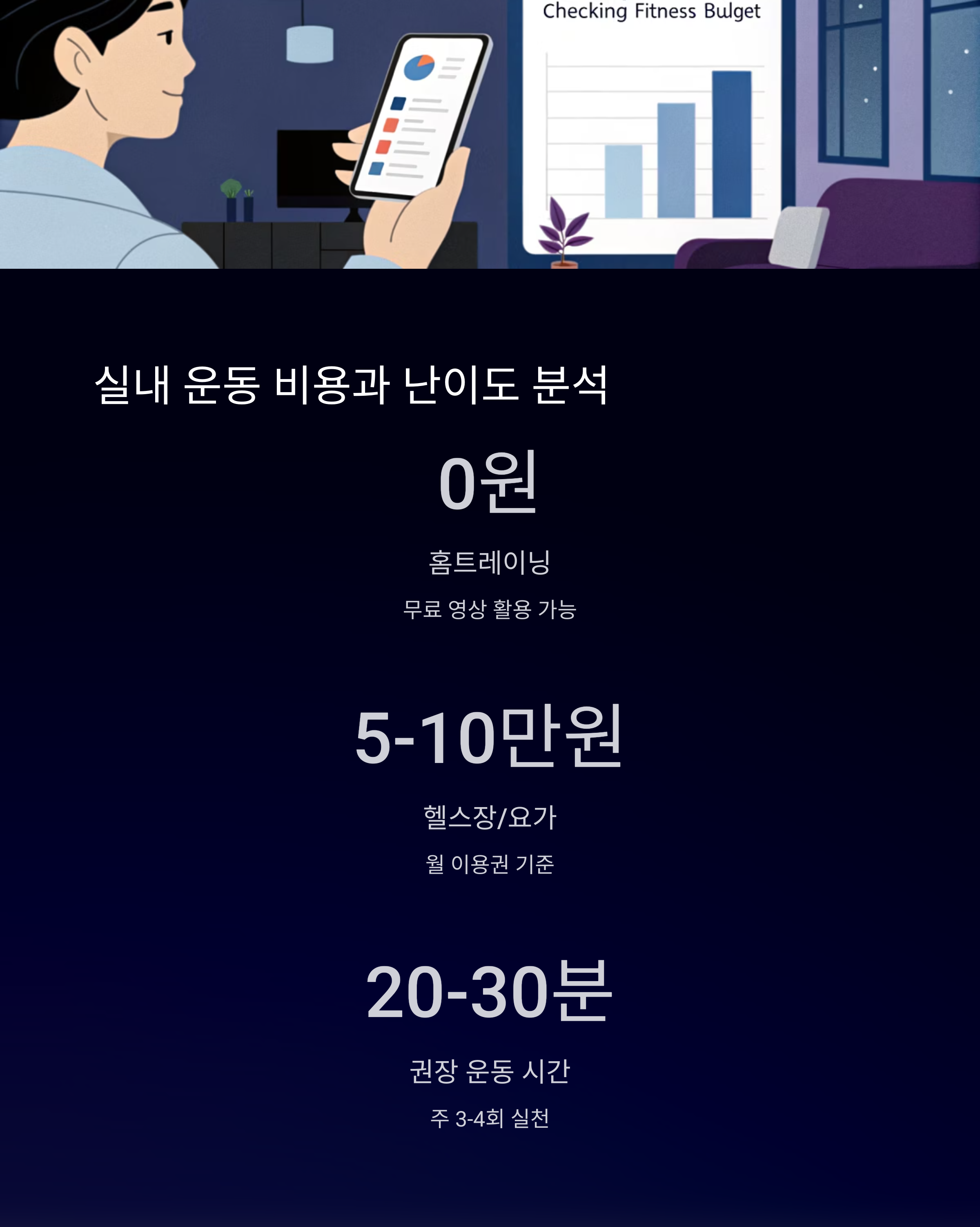 대부분 실내 운동은 무료 또는 저렴한 비용으로 가능하며,