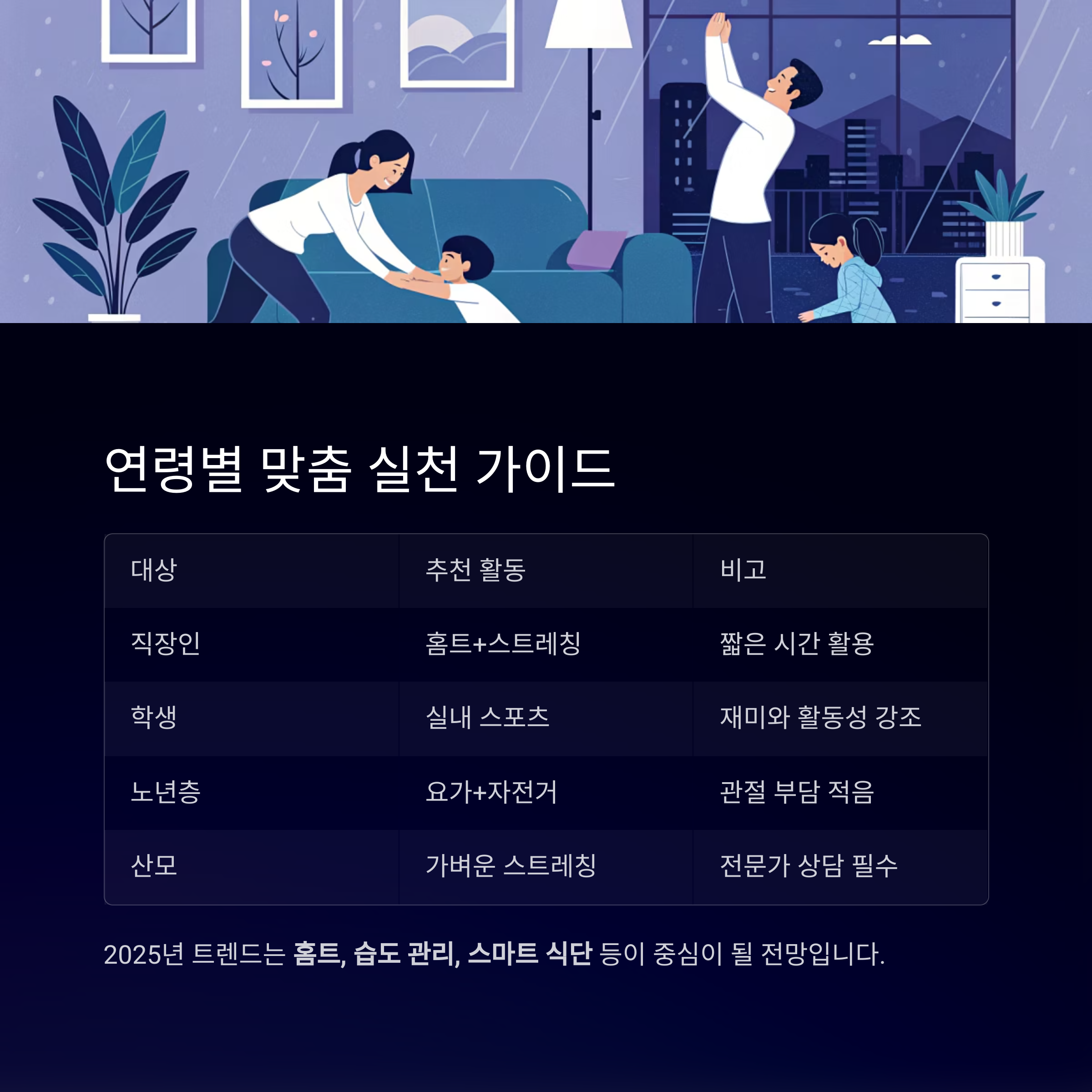 | 직장인 | 홈트+스트레칭 | 짧은 시간 활용 |
