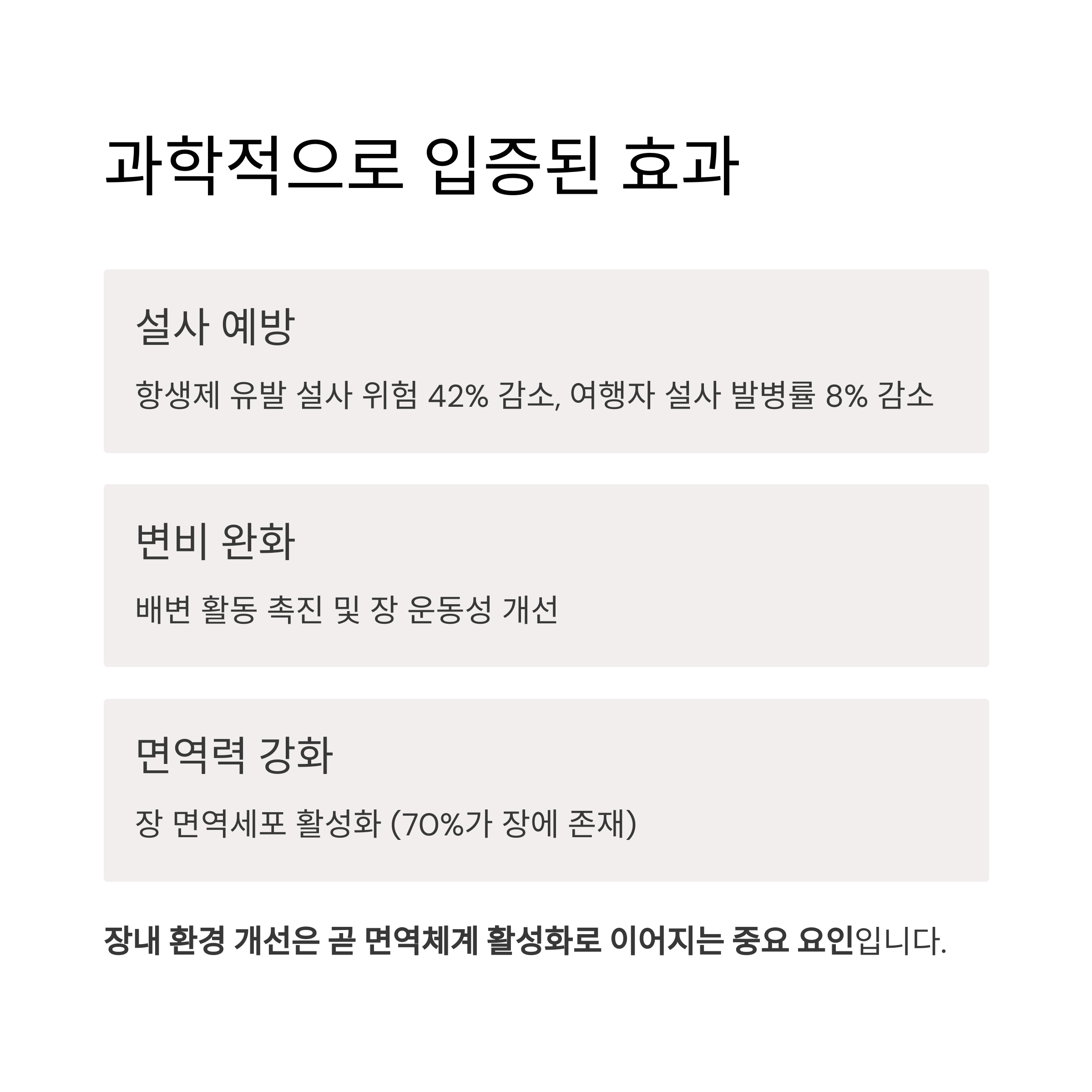 | 면역력 강화 | 장 면역세포 활성화 (70%가 장에 존재) |