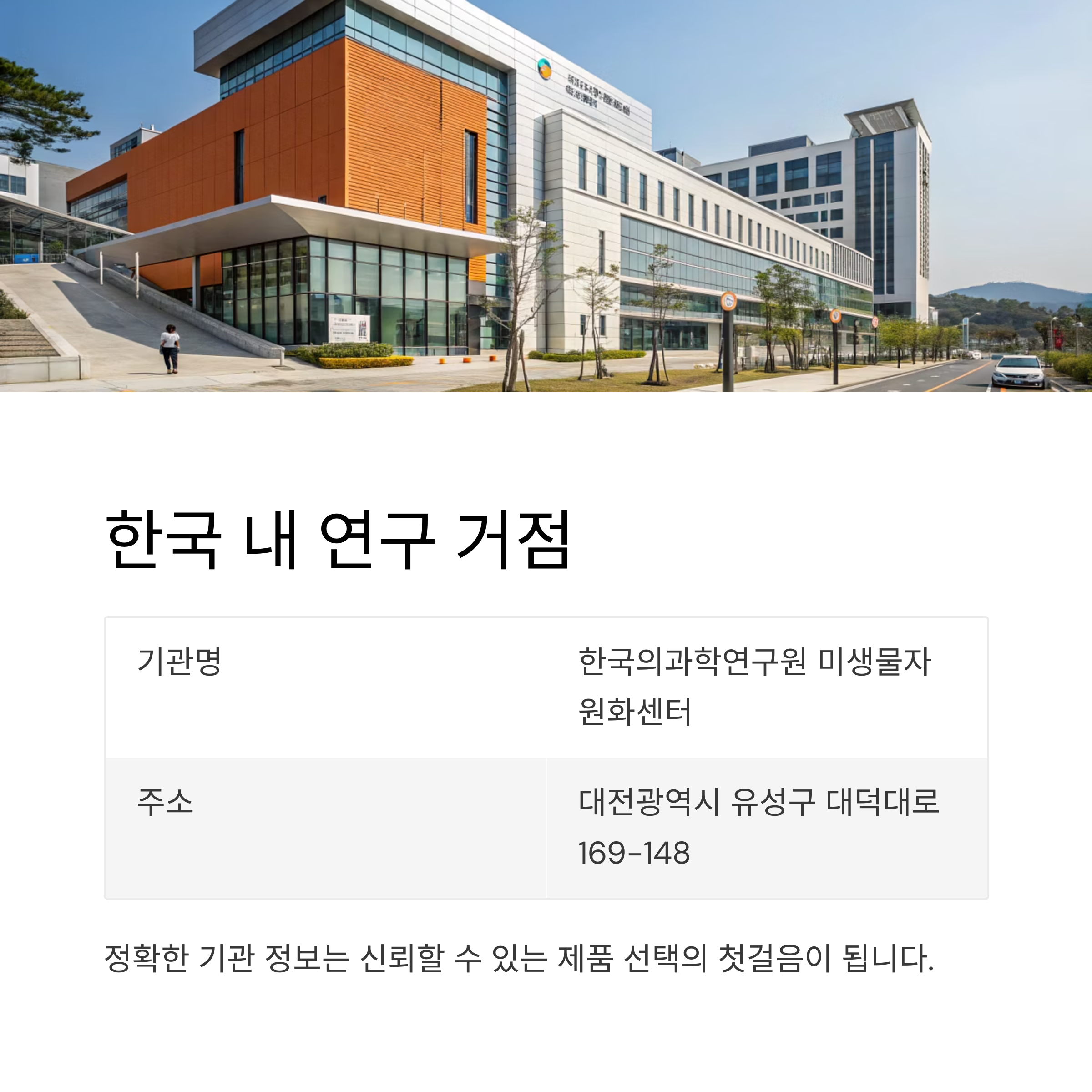 | 한국의과학연구원 미생물자원화센터 | 대전광역시 유성구 대덕대로 169-148 |