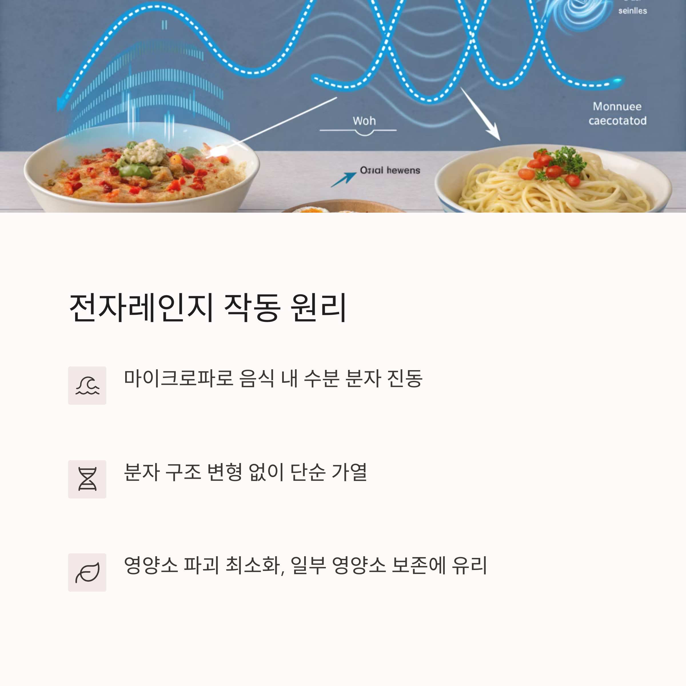 이 마이크로파는 음식 속 물 분자를 진동시켜 마찰열을 발생시키고, 이 열이 음식을 데우는 원리입니다.