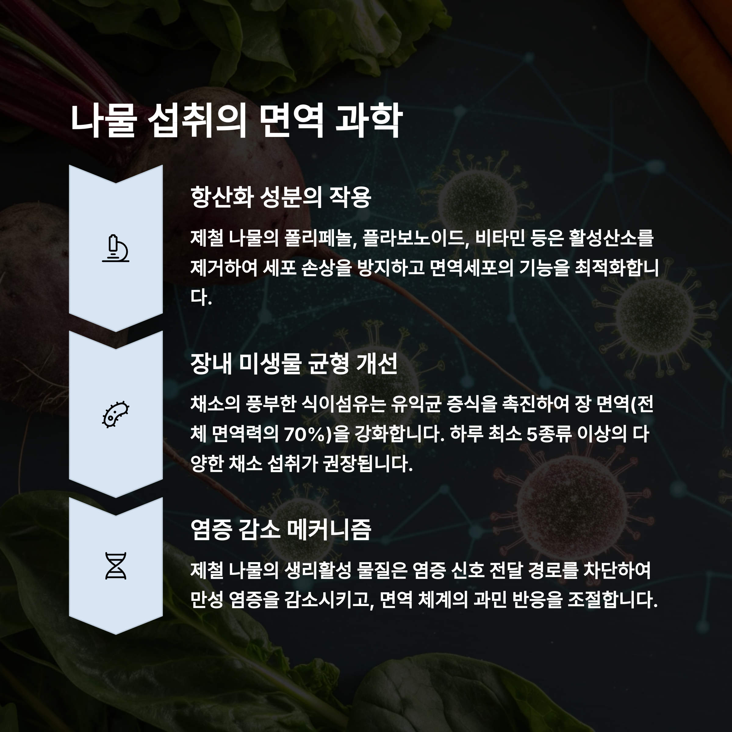 또한 제철 나물에는 파이토뉴트리언트라는 식물성 영양소가 풍부한데, 이것이 병원균과 싸우는 면역 체계를 지원한다는 연구 결과도 있어요.