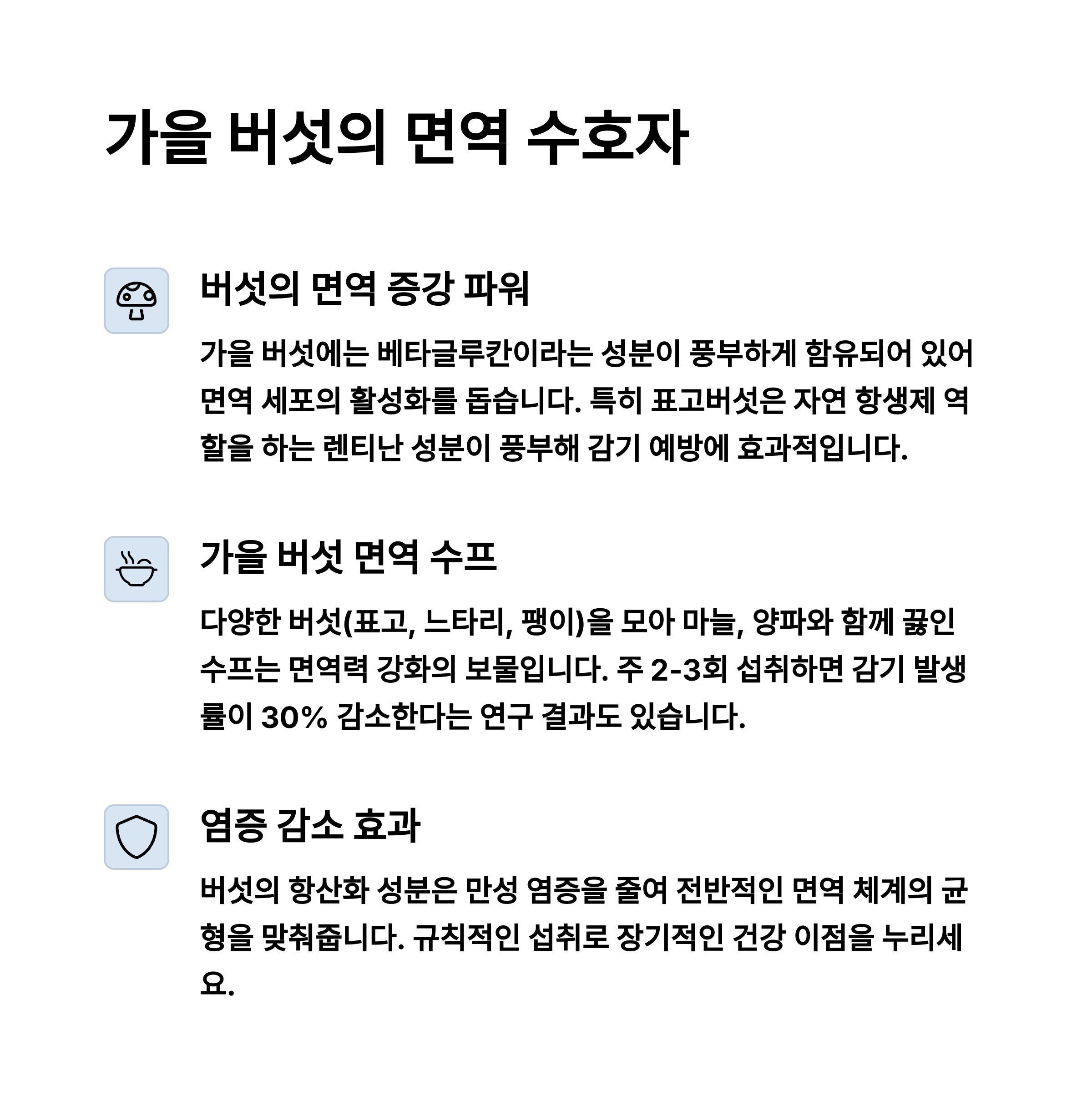 - 버섯: 면역 조절 효과가 있는 베타글루칸 풍부