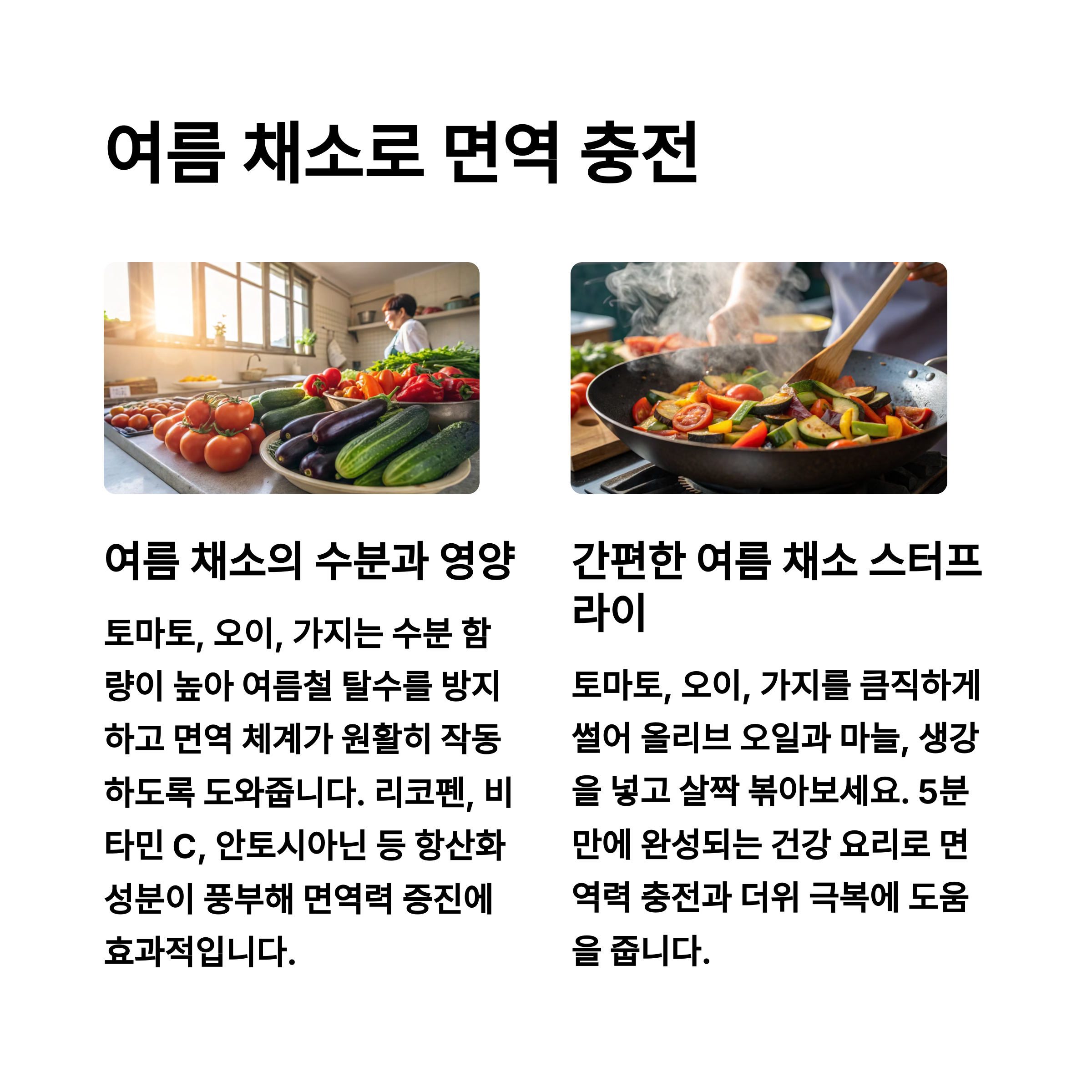 - 오이: 수분이 풍부하고 가벼운 맛으로 여름 요리에 적합합니다