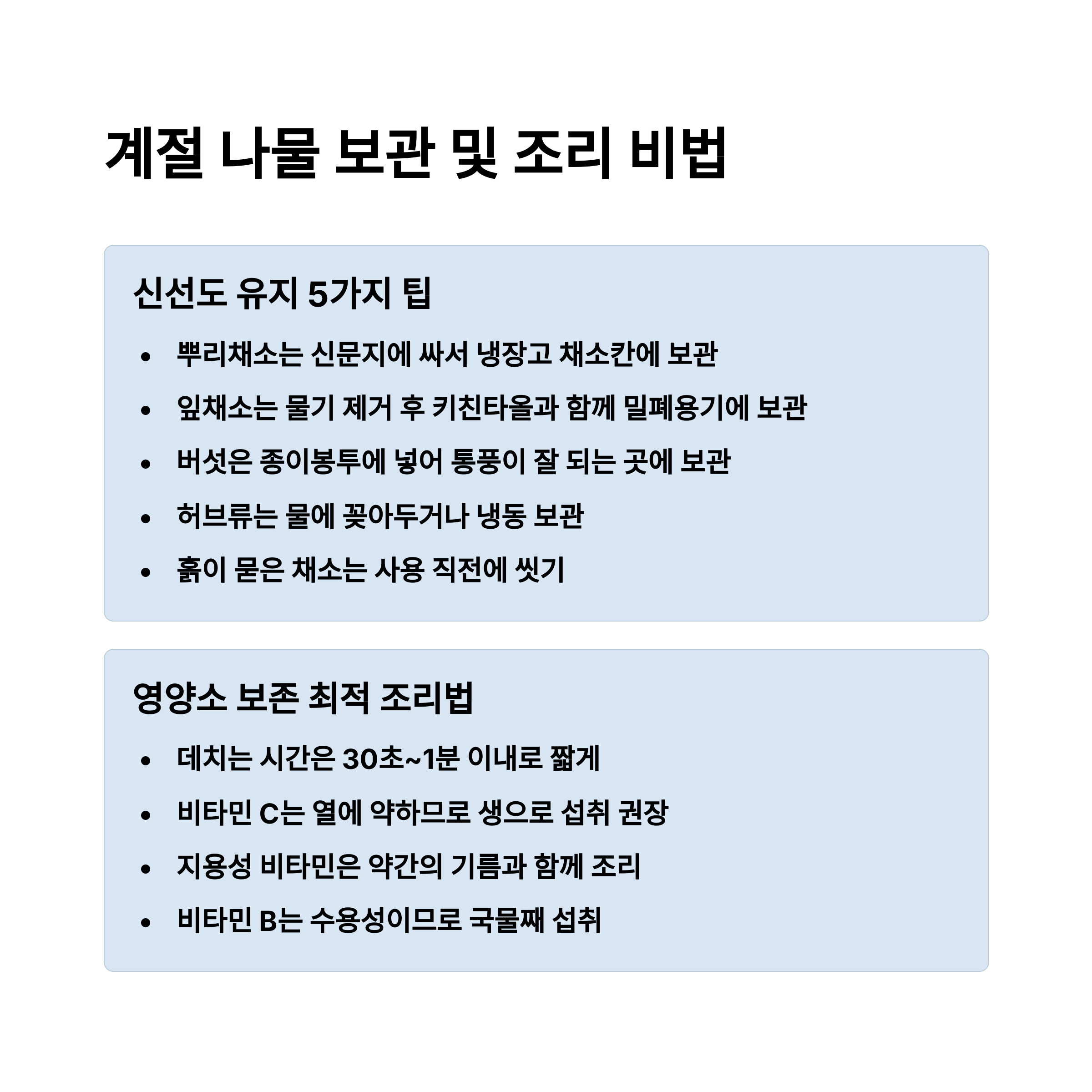 오늘 소개해드린 제철 나물 레시피들은 단순히 맛있는 음식을 넘어 우리 몸의 면역 체계를 강화하는 자연의 약이라고 할 수 있습니다. 계절마다 다양한 제철 나물을 활용해 건강한 밥상을 차려보세요.