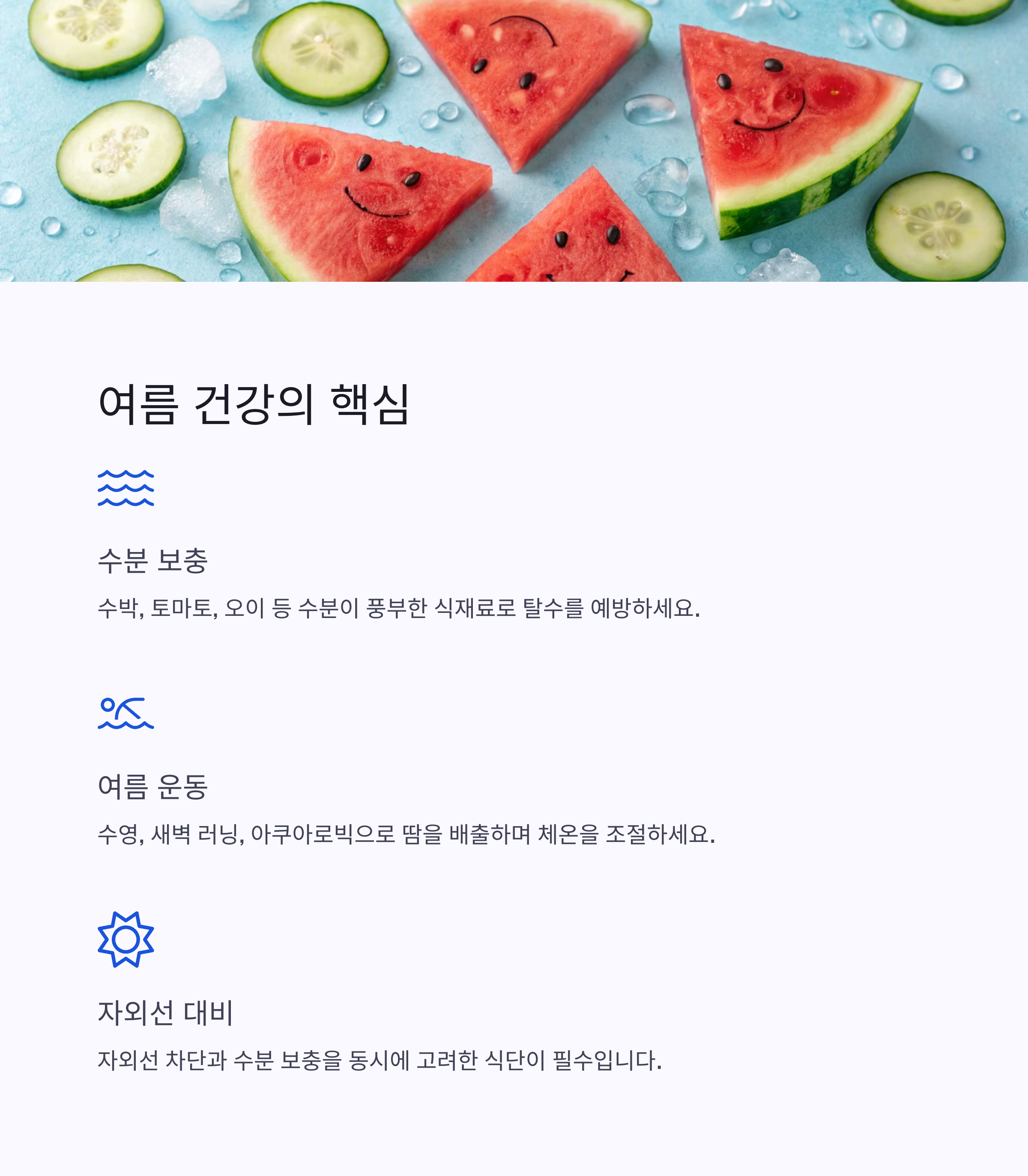 자외선 차단과 수분 보충을 동시에 고려한 식단이 필수입니다.
