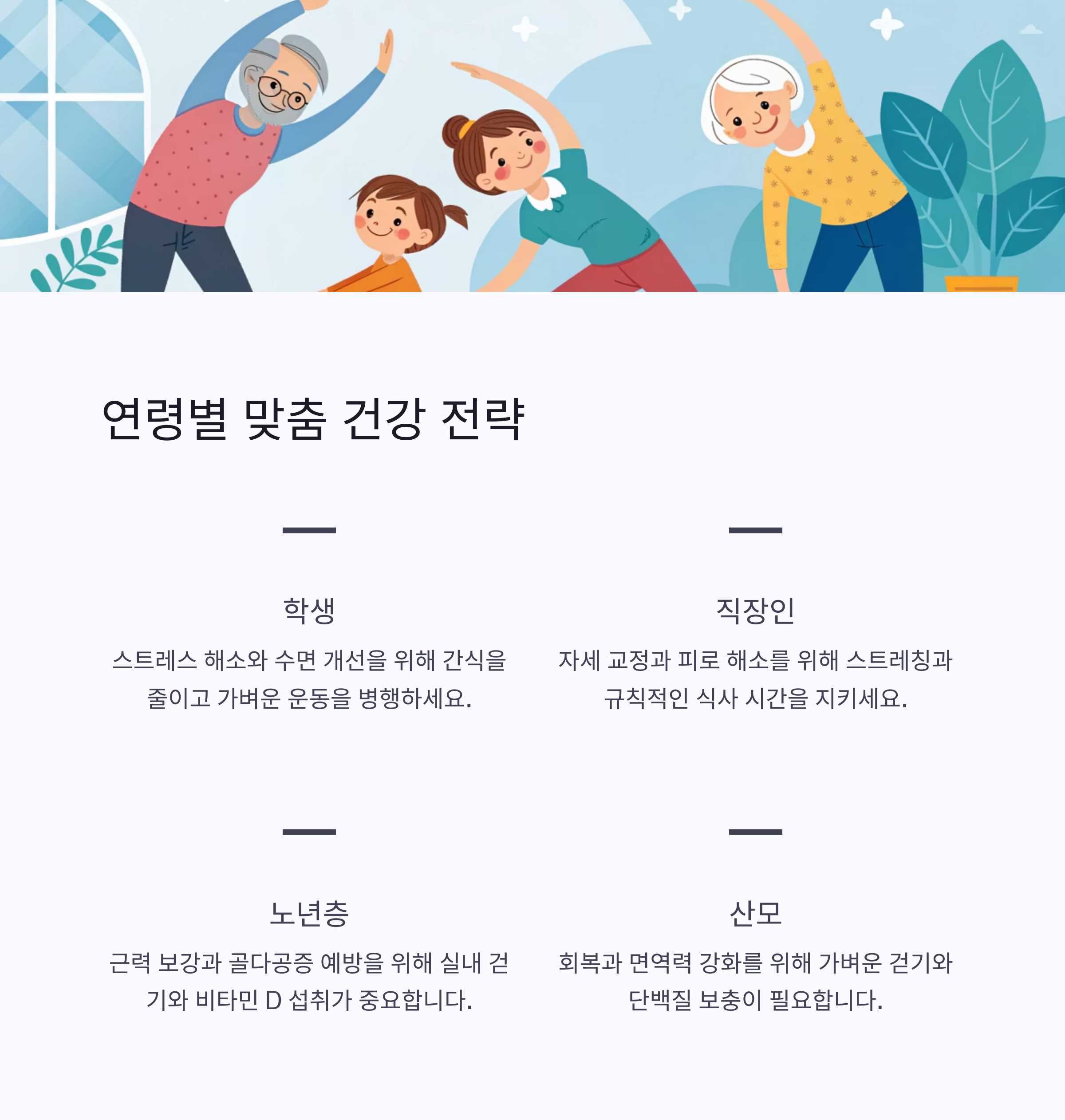 학생, 직장인, 노년층, 산모까지 각각의 건강 전략은 다음과 같습니다.