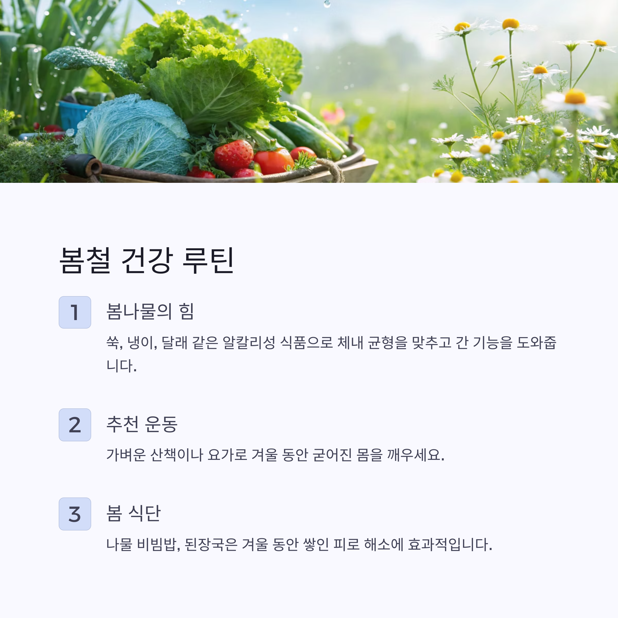 봄에는 긴 겨울로 인해 지친 몸과 마음을 회복시키는 것이 중요합니다.