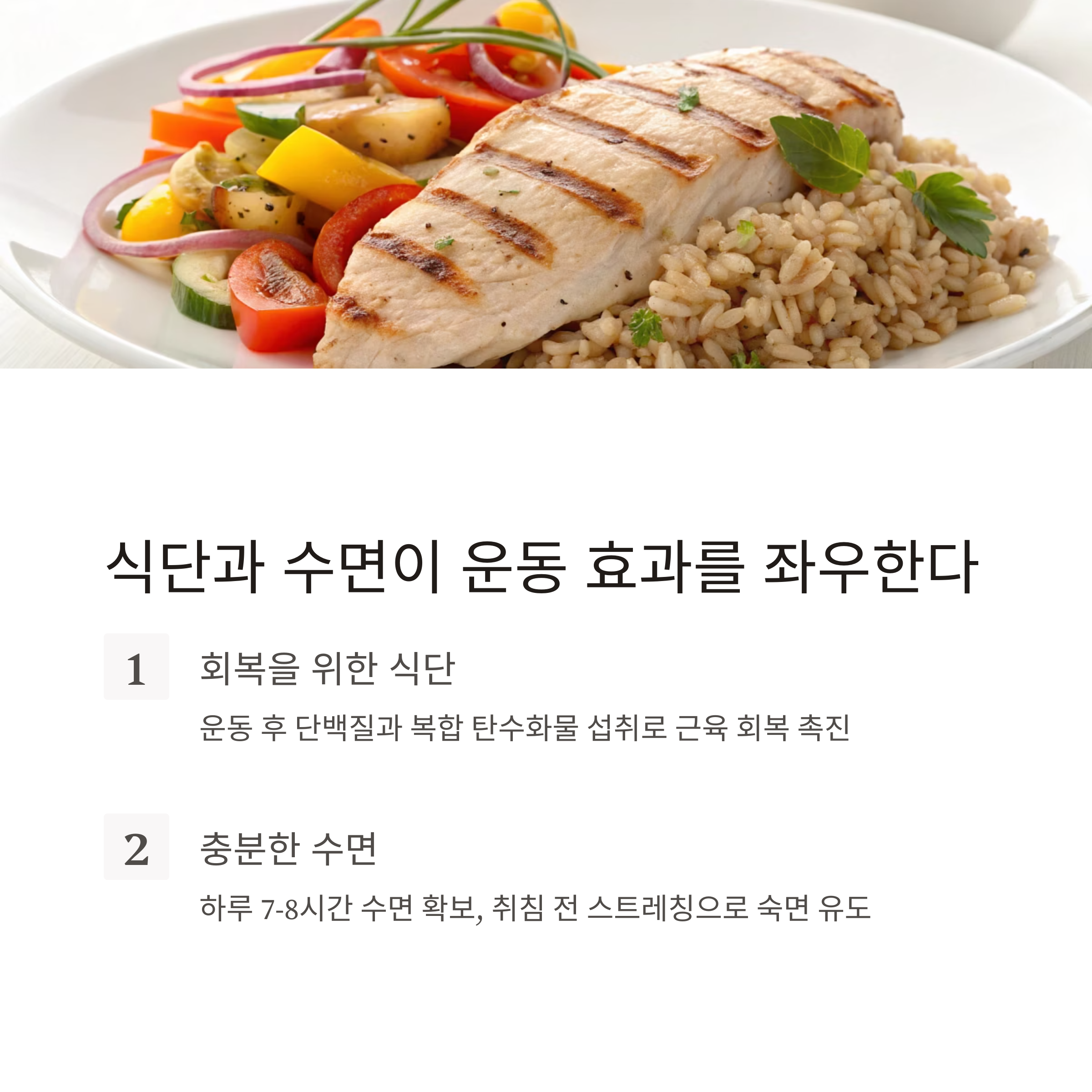 운동 후 단백질과 복합 탄수화물의 섭취는 근육 회복과 에너지 보충에 필수입니다.